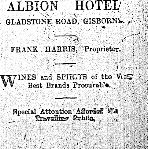 ALBION HOTEL GLADSTONE. HOAD, GISBOKNL. rfr FRANK HARRIS, Proprietor. W INES and SITKITS of the To® Best Brands Procurable. Special Attention ASort&saf Ssjvdifes' SfchliC, , : *