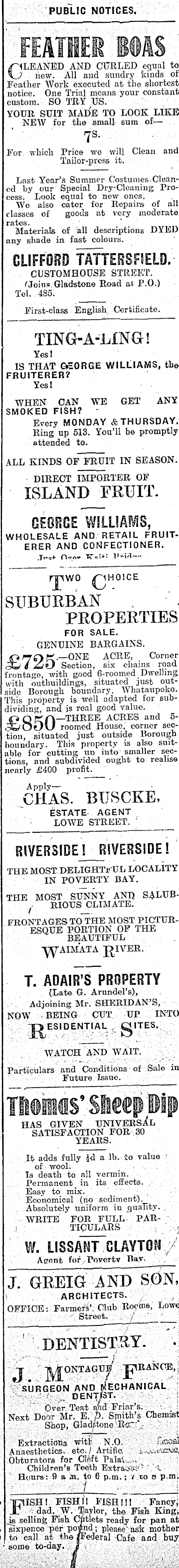 PUBLIC NOTICES. FEATHER BOAS LEANED AND CURLED equal to \J new. All and sundry kinds of Feather Work executed at the shortest notice. One Trial means your constant custom. SO TRY US. YOUR SUIT MADE TO LOOK LIKE NEW for the small- sum of— 7 s - For which Price wc will Clean and Tailor-press it. Last Year’s Summer Costumes. Cleaned by our Special Dry-Cleaning Process. Look equal to new ones. We also cater for Repairs of all classes of goods at very moderate rates. Materials of all descriptions DYED any shade in fast colours. CLIFFORD TATTERSFIELD. CUSTOMHOUSE STREET. TJoins Gladstone Road at P. 0.) Tel. 485. First-class English Certificate. TING-A-LING! Yesl IS THAT OEORGE WILLIAMS, the FRUITERER? Yes! WHEN CAN WE GET’ ANY SMOKED FISH? ~ Every MONDAY & THURSDAY. Ring up 513. You’ll be promptly attended to. ALL KINDS OF FRUIT IN SEASON. DIRECT IMPORTER OF ISLAND FRUIT. GEORGE WILLIAMS, WHOLESALE AND RETAIL FRUITERER AND CONFECTIONER. Jivjf O w Civ rjpwo SUBURBAN PROPERTIES for sale. GENUINE BARGAINS. A? 'TO —ONE ACRE, Corner frontage, with good 6-roomed Dwelling with outbuildings, just outside Borough, boundary, 'Phis property is well adapted for subdividing, and is real good value. jiQK/A —THREE ACRES and 5owOOU roomed House, corner section, situated just outside Borough boundary. This property is also suitable for cutting un into smaller sections, and subdivided ought to realise nearly £4OO profit. CHAS. BUBCKE. ESTATE AGENT LOWE STREET. RIVERSIDE! RIVERSIDE! THE MOST DELIGHTFUL LOCALITY IN POVERTY BAY. THE MOST SUNNY AND SALUB- ■ RIOUS CLIMATE. FRONTAGES TO THE MOST PICTURESQUE PORTION OF THE BEAUTIFUL ■yyAIMATA J^IVER. T. ADAIR’S PROPERTY (Late G. Arundel’s), Adjoining Mr. SHERIDAN’S, NOW BEING CUT UP INTO : R ESI WATCH AND WAIT. Particulars and Conditions of Sale in Future Issue. DENTIAL gITES. Thomas* Sheep ;Blp HAS GIVEN UNIVERSAL SATISFACTION FOR 30 YEARS. It adds fully a lb. to value of wool. Is death to all vermin. Permanent in its effects. Easy to mix. ' , Economical (no sediment). Absolutely uniform in quality. WRITE FOR FULL PARTICULARS W. LISSAPTr SLAYTON Agent for., Poverty Bay. J. GREIG AND SON, ARCHITECTS. ~ OFFICE: Farmers’. Club Rooms, Lowe Street. ■ / dentistry. j JpiRANCE, SURGEON AND MECHANICAL DENTIST. 'V Over Teat ahd Friar’s. "ext Door Mr. E. p. Smith’s Chemist Shop, Gladstone Ec’ - Extractions with N.O. naesthetics, etc. / Arfcific, i ktu raters for Cleft PalaU...,, Children’s Teeth Extr&w'Ar' S; ' ”, Hours: 9am. to 6 p.m.; t to ap m. F ISH! FISH!I FISH!!! Fancy, dad, W. T]aylor, the Fish King, selling Fish Chtlets ready for pan at xpence per pofnd; please'ask mother i call at the |Federal Cafe and buy ime to-day. J