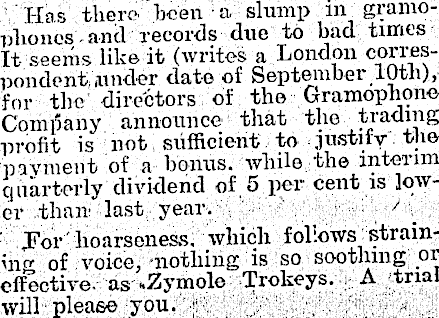 Has there been a slump in gramo-phones-and records due to bad times It- seems like it (writes a London correspondent under date of September 10th), for the directors of the Gramophone Company announce 1 that the trading profit is not sufficient to justify the payment of a bonus, while the inteiim quarterly dividend of 5 per cent is lower than last year. 7 Jfor hoarseness, which follows straining of voice, nothing is so soothing or effective, as ..Zymole Trokeys. A trial will please you.