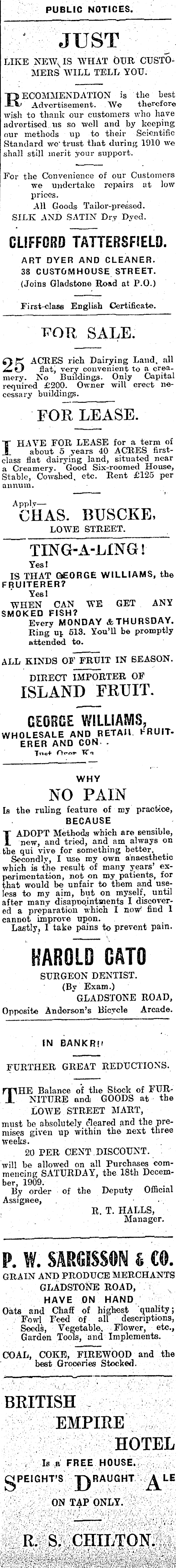 PUBLIC NOTICES. ' JUST LIKE NEW, IS WHAT OUR CUSTOMERS WILL TELL YOU. Recommendation is the best ' Advertisement. We therefore wish to thank our customers who have advertised us so well and by keeping our methods up to their Scientific Standard we' trust that during 1910 we shall still merit your support. For the Convenience of our Customers we undertake repairs at low prices. All Goods Tailor-pressed. SILK AND SATIN Dry Dyed. CLIFFORD TATTERSFIELD. ART DYER AND CLEANER. 38 CUSTOMHOUSE STREET. (Joins Gladstone Road at P. 0.) First-class English Certificate. TOR SALE. Q K ACRES rich Dairying Land, all O flat, very convenient to a creamery. No Buildings. Only Capital required £2OO. Owner will erect necessary 7 buildings. FOR LEASE. I HAVE FOR LEASE for a term of about 5 years 40 ACRES firstclass flat dairying land, situated near a Creamery. Good Six-roomed House, Stable, Cowshed, etc. Rent £125 per annum. Ap chas. BUSCKE. LOWE STREET. TXNG-A-LING! Yes! IS THAT GEORGE WILLIAMS, the FRUITERER? Yes! WHEN CAN WE GET ANY SMOKED FISH? Every MONDAY & THURSDAY. Ring up 513. You’ll be promptly attended to. ALL KINDS OF FRUIT IN SEASON. DIRECT IMPORTER OF ISLAND FRUIT. GEORGE WILLIAMS, WHOLESALE AND RETAIL. FRUITERER AND CON - Tnc+ Or»nr TT q WHY NO PAIN Is the ruling feature of my practice, BECAUSE I ADOPT Methods which are sensible, new, and tried, and am always on the qui vive for something better. Secondly, I use my own anaesthetic which is the result of many years’ experimentation, not on my patients, for that would be unfair to them and useless to my aim, but on myself, until after many disappointments I discovered a preparation which I now< find 1 cannot improve upon. Lastly, I take pains to prevent pain. HAROLD CATO SURGEON DENTIST. (By Exam.) " GLADSTONE ROAD, Opposite Anderson’s Bicycle Arcade. IN BANKRU FURTHER GREAT REDUCTIONS. THE Balance of the Stock of FURNITURE and GOODS at the LOWE STREET MART, must be absolutely cleared and the premises given up within the next three weeks. 20 PER CENT DISCOUNT, will be allowed on all Purchases commencing SATURDAY, the 18th Decernboi* 1909. By order of the Deputy Official Assignee, R, T. HALLS, Manager. P. W. SARGISSON S (0. GRAIN AND PRODUCE MERCHANTS GLADSTONE ROAD, HAVE ON HAND Oats and Chaff of highest 'quality; Fowl Feed of all descriptions, Seeds, Vegetable, Flower, etc., Garden Tools, and Implements. COAL, COKE, FIREWOOD and the best Groceries Stocked. BRITISH EMPIRE HOTEL , Is o FREE HOUSE. PEIGHT'S TkRAUGHT ALE s D 1 ON TAP ONLY. A' R. S. CHILTON. . .■' ■ ■■■■■