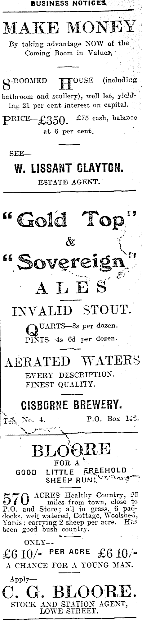 BUSINESS NOTICES. MAKE MONEY By taking advantage NOW of the Coming Boom in Valuer. 8’ bathroom and scullery), -well let, yielding 21 per cent interest on capital. PRICE—£3SO. £7o cash, balance at 6 per cent. BOOMED JJOUSE (including SEE— W. LISSAKT CLAYTON. ESTATE AGENT. “Gold Top 15 & t “ Sovereign, 1 ’ ALBS *' INVALID STOUT. IT ARTS —Ss per dozen. PINTS —4s 6d per dozen. AERATED WATERS EVERY DESCRIPTION. FINEST QUALITY. GISBORNE BREWERY. TeAV. No. 4. P-O. Box 14*3. ' " -V BLOOEE FOR A V GOOD LITTLE FREEHOLD SHEEP RUN i • ACRES Healthy Country, -~S O o UF miles from town, close co P.O. and Store; all in grass. v 6 paddocks, well watered, Cottage, Woolsbefi, Yards ; carrying 2 sheep per acre. Has been good bush country. ONLY--£6lO/- PERACRE £6lO/A CHANGE FOR A YOUNG MAX. Applv — C. G-. BLOORE. STOCK AND STATION AGENT, LOWE STREET.