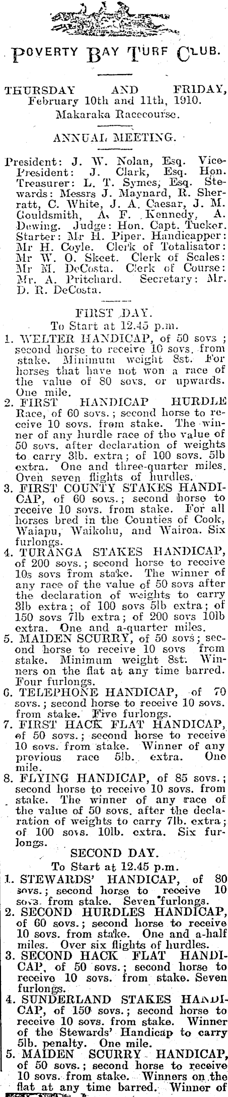 pOVERTY pAY pURF QT.U-B. THURSDAY AND FRIDAY, February 10th and lltli, 1910. Makaraka Racecourse. ANNUAL MEETING. President: J. AY. Nolan, Esq. VicePresident: J. Clark, Esq. Hon. Treasurer: L. T. Symes; Esq. Stewards: Messrs J. Maynard, It. Slierratt, C. White, J. A. Caesar, J. M. Gouldsmith, Ai F. Kennedy. A. Dewing. Judge: Hon. Capt. Tucker. Starter: Mr H. Piper. Handicapper: Mr H. Coyle. Clerk of Totalisator: Mr W. 0. Skeet. Clerk of Scales: Air M. DoCosta. Clerk of Course: Mr. A. Pritchard. Secretary: Mr. D. R. DeCosta. FIRST DAY. To Start at 12.45 p.m. 1. WELTER HANDICAP, of 50 sovs ; second horse to receive 10 sovs. from stake. Minimum weight Bst. For horses that have not won a race of the value of SO sovs. or upwards. One mile. 2. FIRST HANDICAP HURDLE Race, of 60 sovs. ; second horse to receive 10 sovs. from stake. The winner of any hurdle race of the value of 50 sovs. after declaration of weights to carry 31b. extra ; of 100 sovs. 51b extra. One and three-quarter miles. Oven seven flights of hurdles. 3. FIRST COUNTY STAKES HANDICAP, of 60 sous.; second horse to receive 10 sovs. from stake. For all horses bred in the Counties of Cook, Waiapu, Waikohu, and Wairoa. Six furlongs. 4. TURANGA STAKES HANDICAP, of 200 sovs. ; second horse to receive 10s sovs from stake. The winner of any race of the value of 50 sovs after the declaration of weights to carry 31b extra; of 100 sovs slb extra; of 150 sovs 71b extra; of 200 soys 101 b extra. One and a-quarter miles. 5. MAIDEN SCURRY, of 50 sovs; second horse to receive 10 sovs from stake. Minimum weight Bst: Winners on the flat at any time barred. Four furlongs. 6. TELEPHONE HANDICAP, of 70 sovs.; second horse to receive 10 sovs. from stake. Five furlongs. 7. FIRST HACK FLAT HANDICAP, of 50 sovs.; second horse to receive 10 sovs. from stake. Winner of any previous race 51b. extra. One mile. 8. FLYING HANDICAP, of 85 sovs.; second horse to receive 10 sovs. from stake. The wanner of any race of the value of 50 sovs. after the declaration of weighfcs to carry 71b. extra; of 100 so\s. 101 b. extra. Six furlongs. SECOND DAY. To Start at 12.45 p.m. 1. STEWARDS’ HANDICAP, of 80 sovs.; second horse to receive 10 so >3. from stake. Seven‘furlongs. 2. SECOND HURDLES HANDICAP, of 60 sovs.; second horse to receive 10 sovs. from stake. One and a-half miles. Over six flights of hurdles. 3. SECOND HACK FLAT HANDICAP, of 50 sovs.; second horse to receive 10 sovs. from stake. Seven furlongs. 4. SUNDERLAND STAKES HANDICAP, of 150 sovs.; second horse to receive 10 sovs. from stake. Winner of the Stewards’ Handicap to carry 51b. penalty. One mile. 5. MAIDEN SCURRY HANDICAP, of 50 sovs.; second horse to receive 10 sovs. from stake. Winners on the flat at any time barred. Winner of