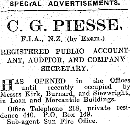 SPECrAL ADVERTISEMENTS. C. G. PIESSE, F.1.A., N.Z. (by Exam.) REGISTERED PUBLIC ACCOUNTANT, AUDITOR, AND COMPANY SECRETARY. HAS OPENED' ill tlio Offices until recently occupied _ by Messrs Kirk, Burnard, and Siovwright, in Loan and Mercantile Buildings. Office Telephone 218, private residence 440. P.O. Box 149. Sub-agent Sun Fire Office.