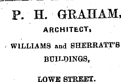 P. H. GRAHAM, ARCHITECT, WILLIAMS and SHERRATT’B BUILDINGS, LOWE STREET.
