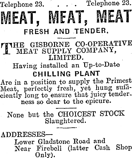 Telephone 23. Telephone 23. MEAT, IV!EAT, MEAT FRESH AND TENDER. HE GISBORNE CO-OPERATIVE MEAT SUPPLY COMPANY, LIMITED. Having installed an Up-to-Date CHILLING PLANT Are in a position to supply the Primest Meat, perfectly fresh, yet hung suniciently long to ensure that juicy tenderness so dear to the epicure. None but the CHOICEST STOCK Slaughtered. ADDRESSES— Lower Gladstone Road and Near Firebell (latter Cash Shop Only).