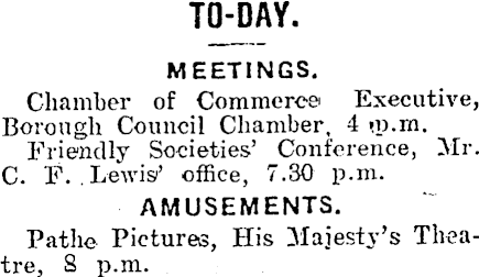 TO-DAY MEETINGS. Chamber of Commerce Executive Borough Council Chamber, 4 *p.rn. Friendly Societies’ Conference, Mr C. F. Lewis’ office, 7.30 p.m. AMUSEMENTS. Pathe Pictures, His Majesty’s Thea tre, S p.m.