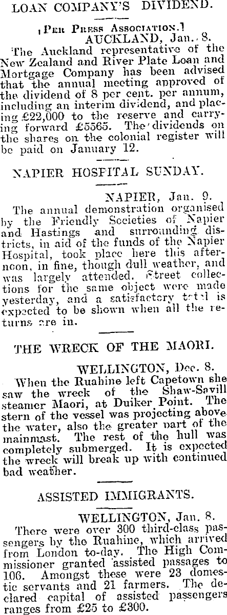 LOAN COMPANY’S DIVIDEND. iPeh Pbrss Association.! AUCKLAND, Jan. 8. The Auckland representative of the New Zealand and River Elate Loan and Mortgage Company has been advised that the annual meeting approved of the dividend of 8 per cent, per annum, including an interim dividend, and placing £22,000 to the reserve and carrying forward £5565. The' dividends on the shares on the colonial register will be paid on January 12. NAPIER HOSPITAL SUNDAY. NAPIER, Jan. 9. The annual demonstration organised by the Friendly Societies of Napier and Hastings and surrounding districts, in aid of the funds of the Napier Hospital, took place here this afternoon, in fine, though dull weather, and was largely attended. Street collections for the same object were made yesterday, and a satisfactory t'td is expected to be shown when all the returns are in. THE WRECK OF THE MAORI. WELLINGTON, Dec. 8. When the Ruabine left Capetown she saw the wreck of the Shaw-boviH steamer Maori, at Duiker Point. Ihe stern of the vessel was projecting above the water, also the greater oart of the mainmast. The rest of the hull was completely submerged. It is expected the wreck will break up with continued bad weather. ASSISTED IMMIGRANTS. WELLINGTON, Jan. 8. There were over 300 third-class passengers by the Ruahiue, which arrived from London to-day. . The High Commissioner granted assisted passages to 106. Amongst these were 23 domestic servants and 21 farmers. .The declared capital of assisted passengers ranges from £25 to £3OO.
