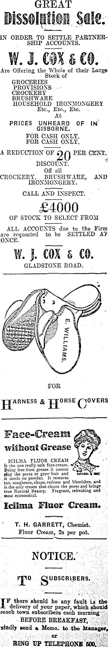 GREAT IN ORDER TO SETTLE PARTNERSHIP ACCOUNTS. w. j. cox § CO. Are Offering the Whole of their Large Stock of GROCERIES PROVISIONS CROCKERY BRUSHWARE HOUSEHOLD IRONMONGERY Etc., Etc., Etc. At PRICES UNHEARD OF IN GISBORNE. FOR CASH ONLY. FOR CASH ONLY. A REDUCTION OF £Q PER CENT. DISCOUNT. Off an CROCKERY. BRUSHWARE, AND IRONMONGERY. CALL AND INSPECT. £4OOO OF STOCK TO SELECT FROM ALL ACCOUNTS due to the Firm are requested to be SETTLED AT ONCE. W. ]. COX 8 CO. GLADSTONE ROAD. FOR JJARNESS & JJORSE QOVERS without Grease ICILMA FLUOR CREAM 5s the one really safe face-cream. Being free from grease it cannot dog the pores or grow hair and it needs no powder. It removes tan, roughness, chaps, redness and blemishes, and is the onlv cream t,hat cleans the pores and bring* true Natural Beauty. Fragrant, refreshing and most economical. Icilma Fluor Cream. T. H. GARRETT, Chemist. Fluor Cream, 2s per pot. NOTICE. T° IF there should be any fault in the delivery of your paper, which should reach town subscribers each morning BEFORE BREAKFAST, iiadly send & Memo, to the Manager, or SING UP TELEPHONE 500. gUBSCRIBERS.