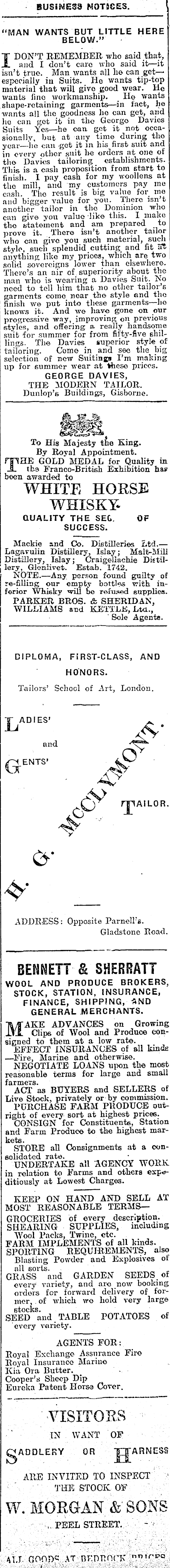 BUSINESS* MOTBCES. “MAN WANTS BUT LITTLE HERE BELOW.” I DON’T REMEMBER who said that, and I don’t care who said it—it isn’t true. Man wants all he can get—especially in Suite. lie wants tip-top material that will give good wear. He wants line workmanship. .Ho wants shape-retaining garments—in fact, he wants all the goodness he can get, and lie can get it in the George Davies Suits Yes —he can. get it not occasionally, but at any time during the ycar _he can get it in his first suit and in every other suit he orders at one of the Davies tailoring establishments. This is a cash proposition from start to finish. I pay cash for my woollens at the mill, and my customers pay me cash. The result is big value for me and bigger value for you. There isn’t another tailor in the Dominion who cun give you value like this. I make the statement and am prepared to prove it. There isn’t another tailor who can give you such material, such stylo, such splendid.cutting, and fit lit anything like my prices, which are two solid sovereigns lower than elsewhere. There’s an air of superiority about the man who is wearing a Davies Suit. No need to tell him that no other tailor’s garments come near the style and the finish we put into these garments —he knows it. And we have gone on our progressive way, improving on previous styles, and offering a really handsome suit for summer for from fifty-five shillings. The Davies superior style of tailoring. Come in and see the big selection of now Suitings I’m making up for summer wear at these prices. GEORGE DAVIES, THE MODERN TAILOR. Dunlop’s Buildings, Gisborne. To His Majesty tiio King. By Roval Appointment. THE GOLD MEDAL for Quality in tb-9 Franco-British Exhibition hag been awarded to WHITE HORSE WHISKYQUALITY THE SEC. OF SUCCESS. Mackie and Co. Distilleries Ltd.— Lagavuiin Distillery, Islay; Malt-Mill Distillery, Islay; Craigeliachie Distillery, Glenlivet. Estab. 1742. NOTE.—Any person found guilty of re-filling our empty bottles with inferior Whisky will be refused supplies. PARKER BROS. & SHERIDAN, WILLIAMS and KETTLE, Ltd., Sole Agents. DIPLOMA, FIRST-CLASS, AND HONORS. Tailors’ School of Art, London. L ADI ES' mid ENTS’ o 1 V rjTAILOR. y & ADDRESS: Opposite Parnell’s. Gladstone Road. BENNETT & SHERRATT WOOL AND PRODUCE BROKERS, STOCK, STATION, INSURANCE, FINANCE, SHIPPING, AND GENERAL MERCHANTS. MAKE ADVANCES on Growing Clips of Wool and Produce consigned to them at a low rate. EFFECT INSURANCES of all kinds —Fire, Marine and otherwise. NEGOTIATE LOANS upon the most reasonable terms for large and small farmers. ACT as BUYERS and SELLERS of Live Stock, privately or by commission. PURCHASE FARM PRODUCE outright of every sort at highest prices. CONSIGN for Constituents, Station and Farm Produce to the highest mar£U3. STORE all Consignments at a oonilidated rate. UNDERTAKE all AGENCY WORK i relation to Farms and others expeitiously at Lowest Charges. KEEP ON HAND AND SELL AT MOST REASONABLE TERMS—GROCERIES of every description. SHEARING SUPPLIES, including Wool Packs, Twine, etc. FARM IMPLEMENTS of all kinds. SPORTING REQUIREMENTS, also Blasting Powder and Explosives of all sorts. GRASS and GARDEN SEEDS of every variety, and are now booking orders for forward delivery of former, of which we hold very large stocks. SEED and TABLE POTATOES of every variety. AGENTS FOR: Royal Exchange Assurance Fire Royal Insurance Marine Kia Ora Butter. Cooper’s Sheep Dip Eureka Patent Horse Cover. VISITORS IN WANT QJ ADDLERY OR OF JJARNESS ARE INVITED TO INSPECT THE STOCK OF W. MORGAN & SONS , PEEL STREET. ALL GOODS AT BEDROCK nn,f,pQ