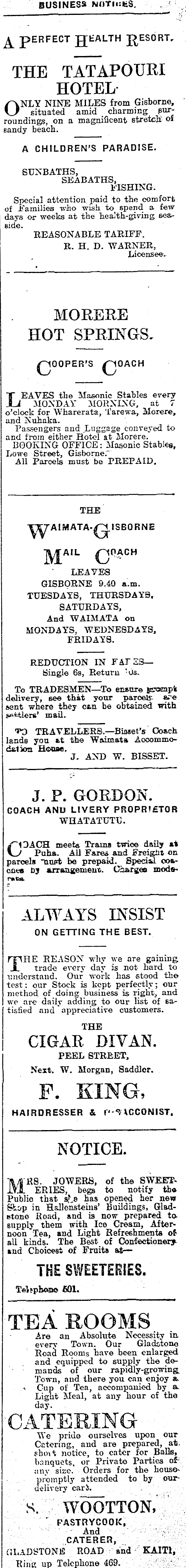 BUSINESS NOTlufcS. pERFECT JJEALTH RESORT. THE TATAPOURI HOTEL ONLY NINE MILES from Gisborne, situated amid _ charming purroundings, on a magnificent stretch of eandy beach. A CHILDREN’S PARADISE. SUNBATHS, SEABATHS, FISHING. Special attention paid to the comfort of Families %vho wish to spend a few days or weeks at the health-giving seaside. REASONABLE TARIFF. R. H. D. WARNER, Licensee. MORERE HOT SPRINGS. /-10ACH LEAVES the Masonic Stables every .MONDAY MORNING, at 7 o’clock for Wharerata, Tarewa, Morere, and Nuhaka. Passengers and Luggage conveyed to and from either Hotel at Morere. BOOKING OFFICE: Masonic Stableg, Lowe Street, Gisborne. All Parcels must be PREPAID. THE ■^rAIMATAM A,L £jPACH LEAVES GISBORNE 9.40 a m. TUESDAYS, THURSDAYS, SATURDAYS, And WAIMATA on MONDAYS, WEDNESDAYS, FRIDAYS. REDUCTION IN FAT 23Single 6s, Return Ms. To TRADESMEN—To ensure delivery, see that your parcel?, ere sent where they can be obtained with settlers’ mail. 'PO TRAVELLERS.—Bisset's Coach lands you at the Waimata Accommodation House. J. AND W. BISSET. J. P. GORDON. COACH AND LIVERY PROPRIETOR WHATATUTU. /~I3ACH meets Trains twice daily at Puha. All Fare* and Freight on parcels Hunt be prepaid. Special ooacnes by arrangement. Charges modsALWAYS INSIST ON GETTING THE BEST. THE REASON why we are gaining trade every day is not- hard to understand. Our work has stood the test: our Stock is kept perfectly ; our method of doing business is right, and wo are daily adding to our list of satisfied and appreciative customers. THE CIGAR DIVAN. PEEL STREET, Next. W. Morgan, Saddler. F. KING, HAIRDRESSER & P NOTICE. MRS. JOWERS, of the SWEET. ERIES, begs to notify tho Publio that s£.e has opened her new Stop in Hsllensteins’ Buildings, Gladstone Road, and is now prepared tosupply them with Ice Cream, Afternoon ’Tea, and Light Refreshments of all kinds. The Best of Confectionery and Choicest of Fruits ai— THE SWEETERIES. Telephone £Ol. TEAROOMS. Are an Absolute Necessity in. every Town. Our Gladstone Road Rooms have been enlarged and equipped to supply the demands of our rapidly-growing. Town, and there you can enjoy a- •. Cup of Tea, accompanied by a Light Meal, at any hour of the day. CATERING Me priuo ourselves upon our Catering, and are prepared, at shmt notice, to cater for Balls, banquets, or Private Parties of any size. Orders for the housepromptly attended to by ourdelivevy cart. s. WOOTTON, PASTRYCOOK, And CATERER, GLADSTONE ROAD and KAITI, Ring up Telephone 469.