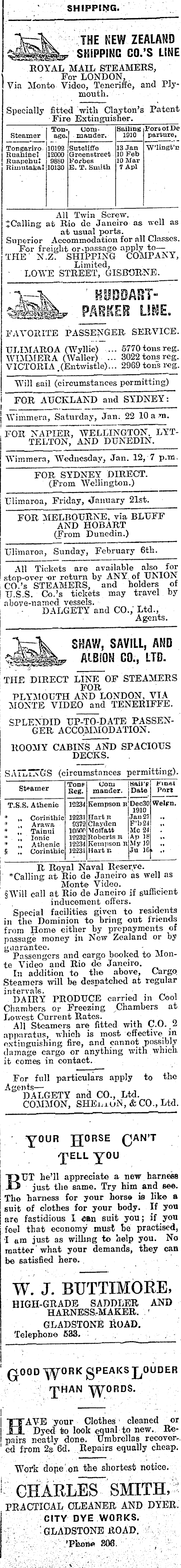 SHIPPING. THE NEW ZEALAND SHIPPING CO.’S LINE ROYAL MAIL STEAMERS, For LONDON, Via Monte Video, Teneriffe, and Plymouth. Specially fitted with Clayton’s Patent Fire Extinguisher. All Twin Screw. at Rio de Janeiro as well as at usual ports. Superior Accommodation for all Classes. For freight ompassage apply to — THE N.Z. SHIPPING COMPANY, Limited, LOWE STREET, GISBORNE. FAVORITE PASSENGER SERVICE. ULIMAROA (Wyllie) ... 5770tonsreg. WIMMERA (Waller) ... 3022 tons reg. VICTORIA (Entwistle)... 2969 tons reg. Will sail (circumstances permitting) FOR AUCKLAND and SYDNEY: Wimmera, Saturday, Jan. 22 10 a m. FOR NAPIER, WELLINGTON. LYTTELTON, AND DUNEDIN. Wimmera, Wednesday, Jan. 12, 7 p.m. FOR SYDNEY DIRECT. (From Wellington.) Ulimaroa, Friday, January 21st. FOR MELBOURNE, via BLUFF AND HOBART (From Dunedin.) Ulimaroa, Sunday, February 6th. All Tickets are available also_ for stop-over or return by ANY of UNION CO.’s STEAMERS, and holders of TJ.S.S. Co.’s tickets may travel by above-named vessels. DALGETY and CO. Ltd., Agents. SHAW, SAVILL, AND ALBION CO., LTD. THE DIRECT LINE OF STEAMERS FOR PLYMOUTH AND LONDON, VIA MONTE VIDEO and TENERIFFE. SPLENDID UP-TO-DATE PASSENGER ACCOMMODATION. ROOMY CABINS AND SPACIOUS DECKS. SAiujcaGS (circumstances permitting). R Royal Naval Reserve. at Rio de Janeiro as well as Monte Video. §Will call at Rio de Janeiro if sufficient inducement offers. Special facilities given to residents in the Dominion to bring out friends from Home either by prepayments of passage money in New Zealand or by guarantee. Passengers and cargo booked to Monte Video and Rio de Janeiro. In addition to the above, Cargo Steamers will be despatched at regular intervals. . , . ~ , DAIRY PRODUCE carried m Cool Chambers or Freezing Chambers at Lowest Current Rates. # All Steamers are fitted with C.O. _-> apparatus, which is most effective in extinguishing fire, and cannot possibly damage cargo or anything with which it comes in contact. For full particulars apply to the .gents— DALGETY and CO., Ltd. COMMON, SHEjlxuN, & CO., Ltd. Y our H orse C an ’ t YELL Y OU BUT he’ll appreciate a new harness just the same. Try him and see. The harness for your horse is like a suit of clothes for your body. If you are fastidious I ean suit you; if you fool that economy must be practised, I mn just as willing to help you. No matter what your demands, they can be satisfied here. W. J. BUTTIMORE, HIGH-GRADE SADDLER AND HARNESS-MAKER. ’ GLADSTONE ROAD. Telephone 533. Q.OOD^Y ORK gPEAKS rjiHAN HAVE your Clothes cleaned or Dyed to look equal to new. Repairs neatly done. Umbrellas recover-, ed from 2s 6d. Repairs equally cheap. Wotk dope on the shortest notice. CHARLES SMITH, PRACTICAL CLEANER AND DYER. CITY DYE WORKS. GLADSTONE ROAD. 'Phone 808.