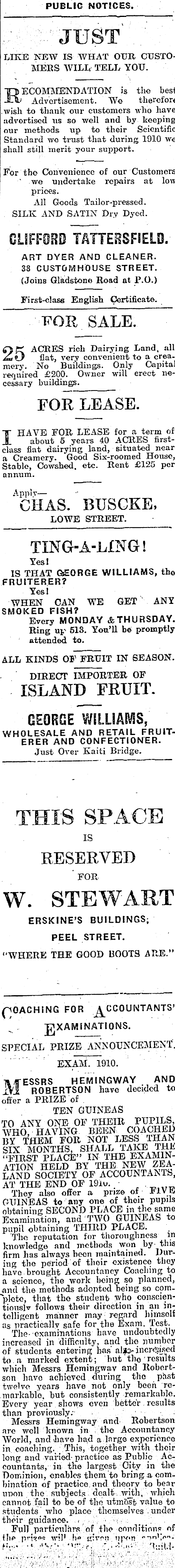 PUBLIC NOTICES. JUST LIKE NEW IS WHAT OUR CUSTOMERS WILL TELL YOU. Recommendation h the best ' Advertisement. We therefore wish to thank our customers who have advertised us so well and by keeping our methods up to their Scientific Standard we trust that during 1910 we shall still merit your support. For the Convenience of our Customers ' we undertake repairs at low prices. All Goods Tailor-pressed. SILK AND SATIN Dry Dyed. CLIFFORD TATTERSFSELD. ART DYER AND CLEANER. 38 CUSTOMHOUSE STREET. (Joinß Gladstone Road at P. 0.) First-class English Certificate. TOR SALE. £y ACRES rich Dairying Land, all flat, very convenient to a creamery. No Buildings. Only Capital required £2OO. Owner will erect necessary buildings. FOR LEASE. I HAVE FOR LEASE for a term of about 5 years 40 ACRES firstclass flat dairying land, situated near a Creamery. Good Six-roomed House, Stable, Cowshed, etc. Rent £125 per annum. Appiv— CHAS. BUSCKE, LOWE STREET. TXNG-A-LING! Yes! IS THAT GEORGE WILLIAMS, the FRUITERER? Yesl WHEN CAN WE GET ANY SMOKED FISH? Every MONDAY & THURSDAY. Ring up 513. You’ll be promptly attended to. ALL KINDS OF FRUIT IN SEASON. DIRECT IMPORTER OF ISLAND FRUIT. GEOROE WILLIAMS, WHOLESALE AND RETAIL FRUITERER AND CONFECTIONER. Just Over Kaiti Bridge. THIS SPACE IS RESERVED ’ FOR W. STEWART ERSKINE’S BUILDINGS; PEEL STREET. “WHERE THE GOOD BOOTS ARE.” FOR EXAMINATIONS. SPECIAL PRIZE ANNOUNCEMENT. EXAM. 1910. Messrs hemingway and ROBERTSON have decided to offer a PRIZE of ten guineas 3 ANY ONE OF THEIR PUPILS, HO HAVING BEEN COACHED Y THEM FOR NOT LESS THAN IX MONTHS, SHALL TAKE THE FIRST PLACE” IN THE EXAMINTION HELD BY THE NEW ZEAAND SOCIETY OF ACCOUNTANTS, T THE END OF 19iu. They also offer a prize of FIVE UINEAS to any one of their pupils Raining SECOND PLACE in the same xamination, and TWO GUINEAS to Lipil obtaining THIRD PLACE. The reputation for thoroughness in nowledge and methods won by this rm has always been maintained. Durlg the period of their existence they ive brought Accountancy Coaching to science, the work being so planned, k 1 the methods adopted being so comleto, that the student who conscienouslv follows their direction in an indligent manner may regard himself ; practically safe for the Exam. Test. The-examinations have undoubtedly icreased in difficulty, and the number : students entering bus aljo- increased i a marked extent; but tho results hich Messrs Hemingwav and llobertin have achieved during the past velve years have not only been rewritable, but consistently remarkable, very year shows even better results lan previously: Messrs Hemingway and Robertson 'o well known in the Accountancy World, and have had a large experience in coaching. This, together with their long and varied practice as Public Accountants, in the largest City in the Dominion, enables them to bring a combination of practice and theory to bear upon the subjects dealt with, which cannot fail to be- of the utmost value to . students who place themselves . under their guidance. Full particulars of the conditions of tlie pri-?o5 wil 1 given upon