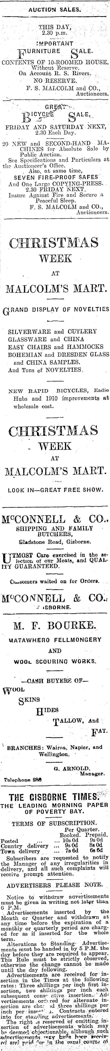 I AUCTION SALES, THIS DAY, 2.30 p.m. IMPORTANT jpURNITURE gA'LE. CONTENTS OF 10-ROOMED HOUSE. Without Reserve. On Account It. S. Rivers. NO RESERVE. F. S. MALCOLM and CO., Auctioneers. GR|&'T--B ic F l 4 S ale : FRIDAY AND SATURDAY NEXT, 2.30 Each Day. 20 NEW and SECOND-HAND MACHINES for Absolute Sale by Public Auction. See Specifications and Particulars at the Auctioneer’!; Office. Also, at same time, SEVEN FIRE-PROOF SAFES And One Large COPYING-PRESS. 2.30 FRIDAY NEXT. Insure Against Fire and Sec'urc a Peaceful Sleep. F. S. MALCOLM and CO., Auctioneers. CHRISTMAS WEEK AT MALCOLM’S MART. Q.RAND DISPLAY OF NOVELTIES SILVERWARE and CUTLERY GLASSWARE and CHINA EASY CHAIRS and HAMMOCKS BOHEMIAN and DRESDEN GLASS and CHINA SAMPLES. And Tons of NOVELTIES. NEW RAPID BICYCLES, Eadie Hubs and 1910 improvements at wholesale cost. CHRISTMAS ' WEEK AT MALCOLM’S MART. LOOK IN—GREAT FREE SHOW. M°CONNELL & CO.. SHIPPING AND FAMILY BUTCHERS, SfcSadstone Road, Gisborne. I UTMOST Car© exercised in the bsJ lection of our Meats, and QUALITY GUARANTEED. Cuotomers waited on for Orders. M°COtfNELL & CO., v iSBORNE. M.. F. BO FREE. MATAWHERO FELLMONGERY AND WOOc SCOURING WORKS. _CASH BUYERS OF—gKINS JJIDEB fj 1 ALLOW, And BRANCHES: Wairna, Napier, and Wellington. Telephone SSfl O. ARNOLD, Manager. THE GISBORNE TIMESP THE LEADING MORNING PAPER OF POVERTY BAY. TERMS OF SUBSCRIPTION. Per Quarter. Booked. Prepaid. Posted ... 10s Od 9s Od Country delivery ... 9sOd BsOd Town delivery ... 7s 6d 6s od Subscribers are requested to notify the Manager of any irregularities in delivery, and all such _ complaints will receive prompt attention. ADVERTISERS PLEASE NOTE. Notice to withdraw advertisements must be given in writing not latpr than G P.M. Advertisements inserted by the Month or Quarter and withdrawn at any time before the expiration of a monthly or quarterly period are charged for as if inserted for the whole term. , , Alterations to Standing- Advertisements must be handed in by 5 P .M. the day before they are required to appear. This Rule must be strictly observed, otherwise the change cannot be made until the day following. . Advertisements are received for insertion. in the Times at the following rates: Three shillings per inqh first insertion, two shillings per inch each subsequent cons'" utive insertion. Advertisements ore I .*, red for alternate insertion are chs: id three shillings per inch per ins< v,,+ .1. Contracts entered into for standing advertisements. The right *s reserved of omitting insertion of advertisements which may be deemed although such advertisemwfa ”>’Ey bams been yecoiypo 1 arid pnid yo?‘ In Die irsvaJ course oi