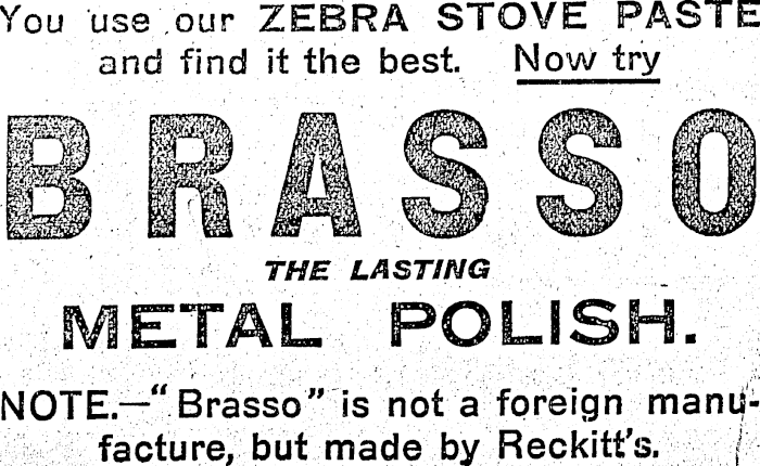 You use our ZEBRA STOVE PASTE and find it the best. Now try ASSO THE LASTING METAL POLISH. NOTE.—“Brasso" is not a foreign manufacture, but made by Reckitt's.