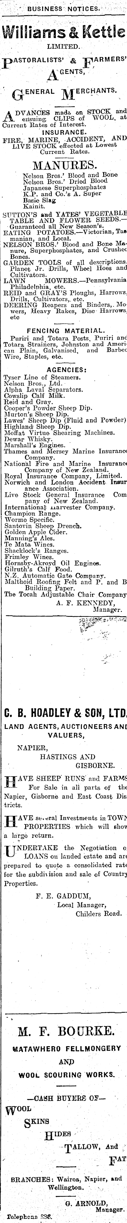 BUSINESS NOTICES. Williams & Kettle LIMITED. >ASTORALISTS’ & F ARMERS’ General M ERCHANTS. ADVANCES mad-s. on STOCK and ensuing CLIPS of WOOL, at Current Hates of Interest. INSURANCE. FIRE, MARINE, ACCIDENT, AND LIVE STOCK effected at Lowest Current Rates. MANURES. Nelson Bros.’ Blood and Bone Nelson Bros.’ Dried Blood Japanese Superphosphates K.JP. and Co.’s A. Super Basic Slag: Kainit. SUTTON’S and YATES 5 VEGETABLE TABLE AND FLOWER SEEDS.— Guaranteed all New Season’s. EATING POTATOES.—Victorian, Tasmanian, and Local. NELSON BROS.’ Blood and Bone Manure, Superphosphates, and Crushed Bones. GARDEN TOOLS of all descriptions. Planet Jr. Drills, Wheel Hoes and Cultivator’s. LAWN MOWERS.—Pennsylvania, Philadelphia, etc. REID and GRAY’S Ploughs, Harrows, Drills, Cultivators,, etc. DEEDING Reapers and Binders,. Mowers, Heavy Rakes, Disc Harrows, etc FENCING MATERIAL. Puriri Totara Posts, Puriri and Totara Strainers, Johnston and American Plain, Galvanised, and Barbed Wire, Staples, etc. AGENCIES: Tyser Line of Steamers. Nelson Bros., Ltd. Alpha Laval Separators. Cowslip Calf Milk. Reid and Grav. Cooper’s Powder Sheep Dip. Murton’s Sheep Dip. Lawes’ Sheep Dip (Fluid and Powder). Highland' Sheep Dip. Moffat Virtue Shearing Machines. Dewar Whisky. Marshall’s Engines. Thames and Mersey Marine Insurance Company. National Fire and Marine Insurance Company of New Zealand. Royal Insurance Company, Limited. Norwich and London Accident Insurance Association. Live Stock General Insurance Company of New Zealand. International .Harvester Company. Champion Range. Wormo Specific. Santovin Sheep Drench. Golden Apple Cider. Manning’s Ales. Te Mata Wines. Shaddock’s Ranges. Frimley Wines. Hornsby-Akroyd Oil Engines. Gilruth’s Calf Food. N.Z. Automatic Gate Company. Malthoid Roofing Felt and P. and B. Building Paper. The Tocah Adjustable Chair Company. A. F. KENNEDY, Manager. G. B. HOADLEY & SON, LTD LAND AGENTS, AUCTIONEERS AN VALUERS, NAPIER, HASTINGS AND GISBORNE. WAVE SHEEP' RUNS and FARMS For Sale in all parts of the Napier, Gisborne and East Coast Districts. HAVE se.tiral Investments in TOWN PROPERTIES which will show a largo return. UNDERTAKE the Negotiation oi LOANS on landed estate and are prepared to quote a consolidated rate for the subdhision and sale of Country Properties. F. E. GADDUM, Local Manager, Childers Road. M. F. BOORKE. WATAWHERO FELLMONGERY AND WOOL SCOURING WORKS. —CASH BUYERS OF—gKINS JJIDEB IJ ALLOW, And BRANCHES: Wairoa, Napier, and Wellington. G. ARNOLD, Manager. rdephcas