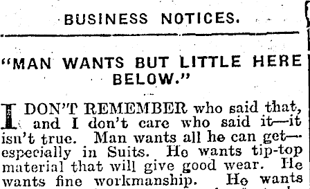 BUSINESS NOTICES. “MAN WANTS BUT LITTLE HERE BELOW.” I DON’T REMEMBER who said that-, and I don’t care who said it—it isn’t true. Man wants all he can get—especially in Suits. Ho wants tip-top material that will give good wear. He wants fine workmanship. Ho wants
