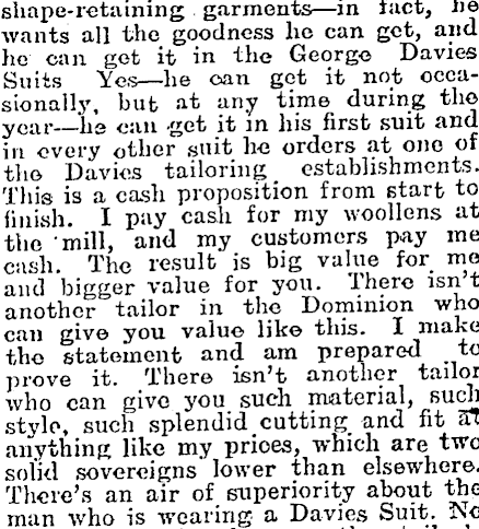 sliape-retaining garments—in fact, he wants all the goodness he can get, and lie can get it in the George Davies Suits Yes—he can get it not occasionally, but at any time during the year—he can get it in his first suit and in every other suit he orders at one of the Davies tailoring establishments. This is a cash proposition from start to finish. I pay cash for my woollens at the mill, and my customers pay me cash. The result is big value for me and bigger value for you. ihere isn t another tailor in the Dominion who can give you value like this. I make the statement and am prepared to prove it. f A'here isn ? t another tailor who can give you such material, such stylo, such splendid cutting and fit at anything like my prioes, which are two solid sovereigns lower than elsewhere. There’s an air of superiority about the man who is wearing a Davies Suit, rso