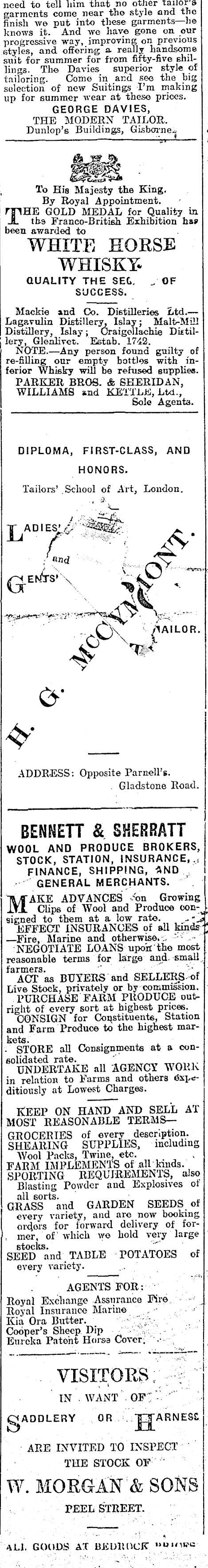 need to tell liim that no other tailor & garments come near the style and the finish we put into these garments —lie knows it. And we have gone on our progressive way, improving on previous styles, and offering a really handsome suit for summer for from fifty-five shillings. The Davies superior style of tailoring. Come in and see the big selection of new Suitings I’m making up for summer wear at these prices. GEORGE DAVIES, THE MODERN TAILOR. Dunlop’s Buildings, Gisborne.;. < To His Majesty the King. By Royal Appointment. THE GOLD MEDAL for Quality in the Franco-British Exhibition ha? been awarded to WHITE HORSE WHISKY* QUALITY THE SEG. „■ OF SUCCESS. Mackie and Co. Distilleries Ltd.— Lagavulin Distillery, Islay; Malt-Mill Distillery, Islay; Craigellachie Dktillery, Glenlivet. Estab. 1742. NOTE.—Any person found guilty of re-filling our empty bottles with inferior Whisky will be refused supplies. PARKER BROS. & SHERIDAN, WILLIAMS and KETTLE, Ltd., Sole Agents. DIPLOMA, FIRST-CLASS, AND HONORS. Tailors’ School of Art, London. T ADIES’,4 L r ■ nnd Q-ENTs' n & & Ox Ado - BAILOR V O' ADDRESS: Opposite Parnell’s. Gladstone Road. BENNETT & SHERRATT WOOL AND PRODUCE BROKERS, STOCK, STATION, INSURANCE,.-; FINANCE, SHIPPING, AND GENERAL MERCHANTS. MAKE ADVANCES 'on Growing Clips of Wool and Produce consigned to them at a low rate. EFFECT INSURANCES of all lands —Fire, Marine and otherwise. ;. r - - NEGOTIATE LOANS upon the most reasonable terms for large and small farmers. ACT as BUYERS and SELLERS of Live Stock, privately or by commission. PURCHASE FARM PRODUCE outright of every sort at highest prices. CONSIGN for Constituents, Station and Farm Produce to the highest markets. STORE all Consignments at a consolidated rate. _ „. UNDERTAKE all AGENCY WORK in relation to Farms and others Expeditiously at Lowest Charges. KEEP ON HAND AND SELL AT MOST REASONABLE TERMS — GROCERIES of every description. SHEARING SUPPLIES, including Wool Packs, Twine, etc. FARM IMPLEMENTS of all kinds. SPORTING REQUIREMENTS, also Blasting Powder and Explosives of all sorts. GRASS and GARDEN SEEDS ot every variety, and are now booking orders for forward delivery of former, of which we hold very large stocks. SEED and TABLE POTATOES of every variety. AGENTS FOR: Royal Exchange Assurance Fir© Royal Insurance Marine Kia Ora Butter. Cooper’s Sheep Dip Eureka Patent Horse Cover. VISITORS IN WANT OF; gADDLERY OR jTJARNESG ARE INVITED TO INSPECT THE STOCK OF W. MORGAN & SONS PEEL STREET. ALL GOODS AT BEDROCK