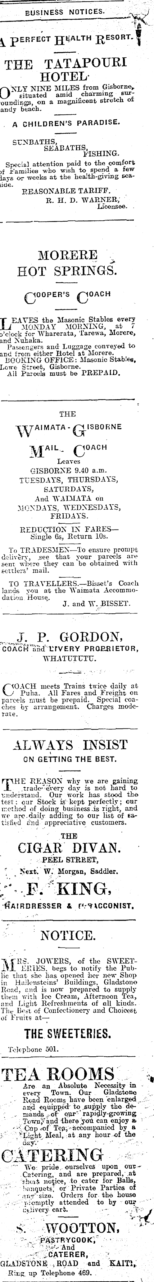 business notices. PERFECT JJEALTH pESORT, i THE TATAPOTJRI HOTEL ONLY NINE MILES from Gisborne,, situated amid charming suroundings, on a magnificent stretch ot andy beach. A CHILDREN’S PARADISE. SUNBATHS, SEABATHS, FISHING. Special attention paid to the comf° r t ■j{ Families ■who wish to spend a few lays or weeks at the health-giving seaside. reasonable tariff. R. H. D. WARNER, Licensee. MORERE . HOT SPRINGS. £JOACH LEAVES the Masonic Stables every MONDAY MORNING, at 7 o’clock for Wharerata, Tarewa, Morere, and Xukaka. Passengers and Luggage conveyed to and trom either Hotel at Morere. BOOKING OFFICE: Masonic Stables, Lowe Street, Gisborne. Ail Parcels must be PREPAID. THE J AIMATA ISBORNE M AIL c Leaves 10ACH GISBORNE 9.40 a.m. TUESDAYS, THURSDAYS, SATURDAYS. And WAIMATA on MONDAYS. WEDNESDAYS, FRIDAYS. REDUCTION IN FARES— Single 6s, Return 10s. To TRADESMEN—To ensure prompt delivery, see that your parcels are sent whore they can be obtained with settlers’ mail. TO TRAVELLERS.—Bisset’s Coach lands you at the Waimata Accommodation House. J. and W. BISSET. J. P. GORDON, COACH and Ur VERY PRORRIETOR, WHATUTUTU. CtOACH meets Trains twice daily at /' Puha. All Fares and Freight on parcels must be prepaid. Special coaches by arrangement. Charges moderate. ALWAYS INSIST CN GETTING THE BEST. THE REASON why we are gaining .trade”every day is not hard to ’understand. Our work lias stood the test: our Stock is kept perfectly; our method of doing business .is right, and wc are. daily adding to our list of satisfied find appreciative customers. THE CIGAR DIVAN. PEEL STREET. ' Next. W. Morgan, Saddler. /'• F. "KING, Hairdresser & u.hxcconist. NOTICE. V fIH. JOWERS, of the SWEETIyJL ERIES. begs to notify the Public that she has opened her new Shop in Hailensteins’ Buildings, Gladstone Road, and is now prepared to supply them with Ice Cream, Afternoon Tea, and Light Refreshments of all kinds. The Best of Confectionery and Choicest of Fruits at — THE SWEETERIES. Telephone 501. TEAROOMS. . Are an Absolute Necessity in every Town. Our Gladstone Road Rooms have been enlarged and equipped" to supply the de- . mands opr" rapidly-growing Towny and there you can enjoy & -• Cup Teg", accompanied by a , v Light Meal, at any hour of the CATERING 4: : We pride ourselves upon our - Catering, and are prepared, at short notice, to cater for Balls, banquets; or Private Parties of • .my size. Orders for the house promptly attended to by our ctlivery cart. • • .. by S WOOTTON, .PASTRYCOOK, And A CATERER, GLADSTONE ROAD and KAITI, Ring up Telephone 469.