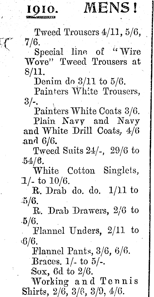 saaiwamgaarza Tweed Trousers 4/11, 5/6, r Special line of “Wire Wove” Tweed Trousers at 8/11. Denim do 3/11 to 5/6. Painters White Trousers, 3/-. , Painters White Coats 3/6. Plain Navy and Navy and White Drill Coats, 4/6 and 6/6. Tweed Suits 24/-, 29/6 to •54/6. White Cotton Singlets, 1/- to 10/6. It. Drab do. do. 1/11 to 5/6. It. Drab Drawers, 2/6 to ■5/6. Plannel Unders, 2/11 to 6/6. Plannel Pants, 8/6, 6/6. Draces. 1/- to 5/-. Sox, 6d to 2/6. Working and Tennis Shirts, 2/6, 3/6, 3/9, 4/6.