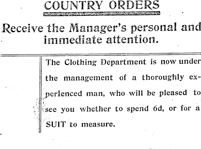 COUNTRY ORDERS Receive the Manager’s personal and immediate attention. The Clothing: Department is now under the management of a thoroughly ex= perienced man, who will be pleased to '■if. VI 1 see you whether to spend 6d, or for a SUIT to measure.