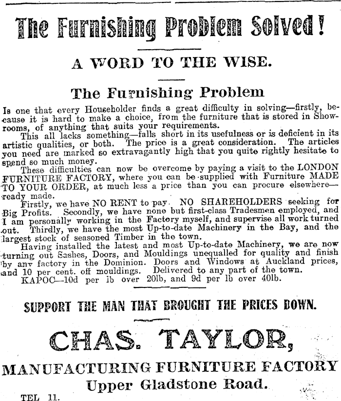 TH€ Furnishing Problem solven! A WORD TO THE WISE. The Furnishing' Problem Is one that every Householder finds a great difficulty in solving—firstly, because it is hard to make a choice, from the furniture that is stored in Showrooms, of anything that suits your requirements. This all lacks something—falls short in its usefulness or is deficient m its artistic qualities, or both. The price is a great consideration. The articles you need are marked so extravagantly high that you quite rightly hesitate to spend so much money. . ...... T rnsrrkrYvr These difficulties can now be overcome by paying a visit to the LOIN DUN FURNITURE FACTORY, where you can be supplied with Furniture MADE TO YOUR ORDER, at much less a price than you can procure elsewhere—readFiStly!’we have NO RENT to pay. NO SHAREHOLDERS seeking for ■Big Profits. Secondly, we have none but first-class Tradesmen employed, and I am personalia working in the Factory myself, and supervise all work turned .out. Thirdly, we have the most Up-to-date Machinery in the Bay, and the largest stock of seasoned Timber in the town. ° Having installed the latest and most Up-to-date Machinery, we are now -turning out Sashes, Doors, and Mouldings unequalled for quality and finish 'by anv factory in the Dominion. Doors and Windows at Auckland prices, And 10 per cent, off mouldings. Delivered to any part of the town. KAPOC—IOd per ib over 201 b, and 9d per lb over 401 b. SUPPORT THE MAN THAT BROUGHT THE PRICES DOWN. CHAS. TAYLOR, MANUFACTURING FURNITURE FACTORY Upper Gladstone Road. TEL 11.