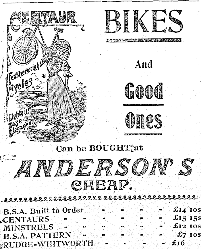 <1 seip I.MO} A * If? g? BIKES And Good Can be BOUGHTJat ANDERSON 9 S eHEHP. B.S.A. Built to Order - - - £l4 ios CENTAURS - - * - - - £ls 15s MINSTRELS ------ £l3 10s B.S.A. PATTERN - - - - - £7 10s eRUDQE- WHITWORTH - - - £l6