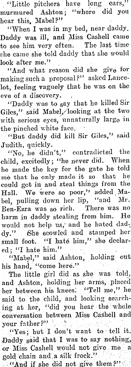“Little pitchers have long ears,” murmured Ashton; “where did you hear this, Mabel?” “When I was in my bed, near daddy. Daddy was ill, and Miss Cashed came to see him very often. The last time •' she came she told daddy that she would look after me.” “And what reason did she giv e for making such a proposal?” asked Lancelot, feeling vaguely that he was on the eve of a discovery. “Daddy was to s ay that he killed Sir Giles,” said Mabel/ looking at the two with serious eyes, unnaturally large in the pinched white face. “But daddy did kill Sir Giles,” said Judith, quickly. “No, he didn’t,” contradicted the child, excitedly; “he never did. When he made the key for the gate he told me that he only made it so that he cotdd get in and steal things from the Hall. We were so poor,’’ added Mabel, pulling down her lip, “and Mr. Ben-Ezra was so rich. There was no harm in daddy stealing from him. He would not help ns," and he hated daddy.” She scowled and stamped her small foot. “I hate him,” she declared; “I hate him.” “Mabel,” said Ashton, holding out his hand, “come here.” The little girl did as she was told, and Ashton, holding her arms, placed her between his kneesi “Tell me,” he said to the child, and looking searching at her, “did you hear the whole conversation between Miss Cashell and your father?” “Yes; hut I don’t want to- tell it. Daddy said that I was to say nothing, or Miss Cashell would not give me a gold chain and a silk frock.” “And if she did not give them?”