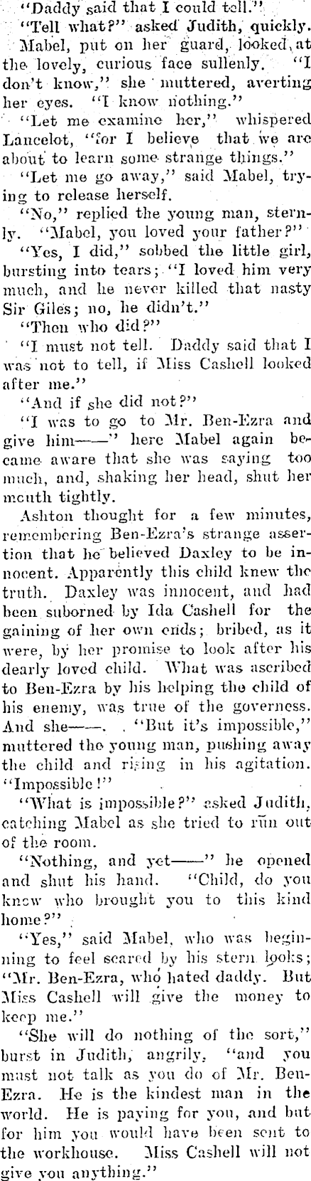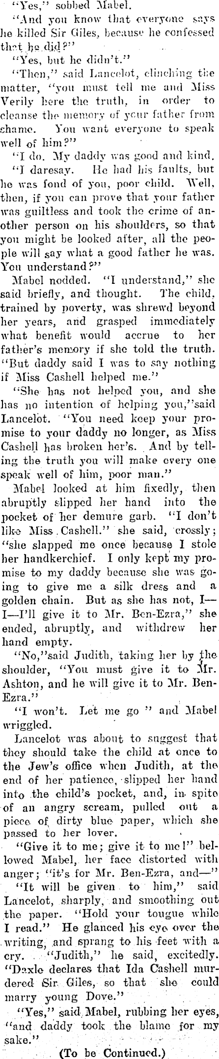 “Yes,” sobbed Alabel. “And you know that everyone says he killed Sir Giles, because lie confessed that beglftl?” ‘Yes, but he didn’t.” “Then,” .said Lancelot, clinching the matter, “you must tell me and Aliss Verily here the truth, in order to cleanse the memory ot your lather from shame. A’ou want everyone to speak well of him?” “I do. Alv daddy was good and kind. “J daresay. Mo bad his faults, but be was fond of you, poor child. AYell, then, if you can prove that your father was guiltless and took the crime of another person on bis shoulders, so that you might be looked alter, all the people will say what a good father he was. You understand?” Alabel nodded. “I understand,” she said briefly, and thought. The child, trained by poverty, was shrewd beyond her years, and grasped immediately what benefit would accrue to her father’s memory if she told the truth. “But daddy said I was to say nothing if Aliss Cashell helped me.” “She has not helped you, and she has no intention of helping you,’’said Lancelot. “You need keep your promise to your daddy no longer, as Aliss Cashell has broken hor’s. And by telling the truth you will make every one speak well of him, poor man.” Alabel looked at him fixedly, then abruptly slipped her hand into the pocket of her demure garb. “I don’t like Aliss . Cashell.” she said, crossly; “she slapped me once because I stole her handkerchief. I only kept my promise to my daddy because she was going to give me a silk dress and a golden chain. But as she has not-, ll—l’llI — I—l’ll give it to Air. Ben-Ezra,” she ended, abruptly, and withdrew her hand empty. “No,’’said Judith, taking her by theshoulder, “A 7 ou must give it to Air. Ashton, and he will give it to Air. BenEzra.” “I won’t. Let me go ” and Alabel wriggled. Lancelot was about to suggest that they should take the child at once to the Jew’s office when Judith, at the end of her patience, slipped her hand into the child’s pocket, and, in. spite of an angry scream, pulled out a piece, of. dirty blue paper, which she passed to her lover. “Give it to me; give it to mo!” bellowed Mabel, her face distorted with anger; “it’s for Air. Ben-Ezra, and —” “It will be given to him,” said Lancelot, sharply, and smoothing out the paper. “Hold your tougue while I read.” He glanced his eye over the writing, and sprang to his feet with a cry. “Judith,” he said, excitedly. “Da.xle declares that Ida Cashell murdered Sir. Giles, so that she could marry young Dove.” “Yes,” said Alabel, rubbing her eyes, “and daddy took the blame for my sake.” (To be Continued.)
