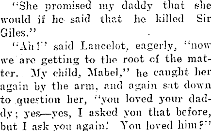“She promised my daddy that she would if he said that he killed Sir Giles.” “Ah!” said Lancelot, eagerly, “now we are getting to the root of the matter. Afy child, Alabel,” lie caught her again by the arm, and again sat down to question her, “you loved your daddy ; yes—yes, I asked you that before, but I ask you again.' A’ou loved him?”