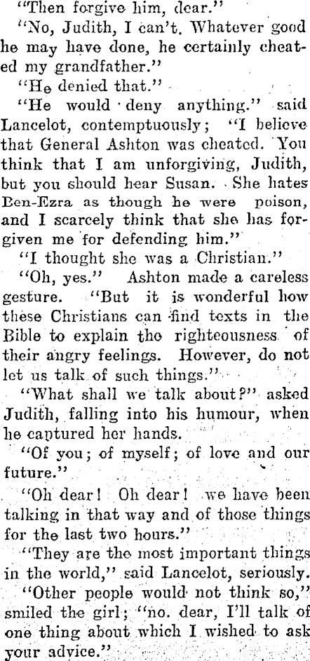 “Then fo-rgive him, dear.” ”No, Judith, I can’t. Whatever good he may have done, he certainly cheated my grandfather.” “H© denied that.” “He would • deny anything.” said Lancelot, contemptuously; “I believe that General Ashton was cheated. You think that I am unforgiving, Judith, but you should hear Susan. She hates Ben-Ezra as though he were poison, and I scarcely think that she has forgiven me for defending him.” “I thought she was a Christian.” “Oh, yes.” Ashton made a careless gesture. “But it is wonderful how these Christians can -find texts in the Bible to explain tho righteousness of their angry feelings. However, do not let us talk of such things.” “What shall we talk about?” asked Judith, falling into his humour, when he captured her hands. “Of you; of myself; of love and our future.” “Oh dear! Oh dear! we have been talking in that way and of those tilings for the last two hours.” “They are the most important things in the world,” said Lancelot, seriously. “Other people would not think so,” smiled the girl ; “no. dear, I’ll talk of one thing about which I w r ished- to ask your advice.”