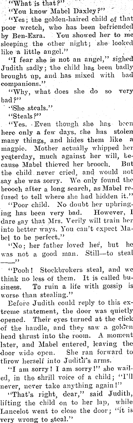 “What is that?” “You know Mabel Daxley?” “Yes; the golden-liaired child of that poor wretch, who has been befriended by Ben-Ezra. You showed her to me sleeping the other night; she looked like a little angel.” “I fear she is not an angel,” sighed Judith sadly; the child ha s been badly brought up, and has mixed with had companions.” “Why, what does she do so very bad?” “She steals.” “Steals?” “Yes. -Even though she has boon hero- only a few days, she has stolen many things, and hides them like a magpie. Mother actually whipped her much against her will, because Mabel thieved her brooch. But the child never cried, and would not say she was sorry. Wo only found the brooch after a long search, as Mabel refused to tell where sli-e had hidden it.” “Poor child. No doubt her upbringing lias been very bad. However, I dare s ay that Mrs. Verily will train her into better ways. You can’t expect Mabel to be perfect.” “No; her father loved her, hut he was not a good man. Still—to steal “Pooh! Stockbrokers steal, and we think no less of them. It is called business. To ruin a life with gossip is worse than stealing.” Before Judith could reply to this extreme statement, the door was quietly opened. Their eyes turned at the click of the handle, and they saw a- golden head thrust into the room. A moment later, and Mabel entered, leaving the door wide open. She ran forward to throw herself into Judith's arms. “I am sorry! I am sorry!” she wailed, in the shrill voice of a child; “I’ll never, never take anything again!” “That’s right, clear,” said Judith, lifting the child on to her lap, while Lancelot went to close the door; “it is very wrong to steal.”