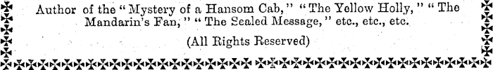 Author of the “ Mystery of a Hansom Cab, ” “ The Yellow Holly, ” “ The Mandarin’s Fan, ” “ The Sealed Message, ” etc., etc., etc. »J< (All Rights Reserved) ►> ►!« ►!< «*!•< ►!-< ►l* ►!« >Z* >J« ►!« ►!« ►!« ►!« <%* d? ►!« ►!< d? ►I < <%? ►!« d? ►!-<