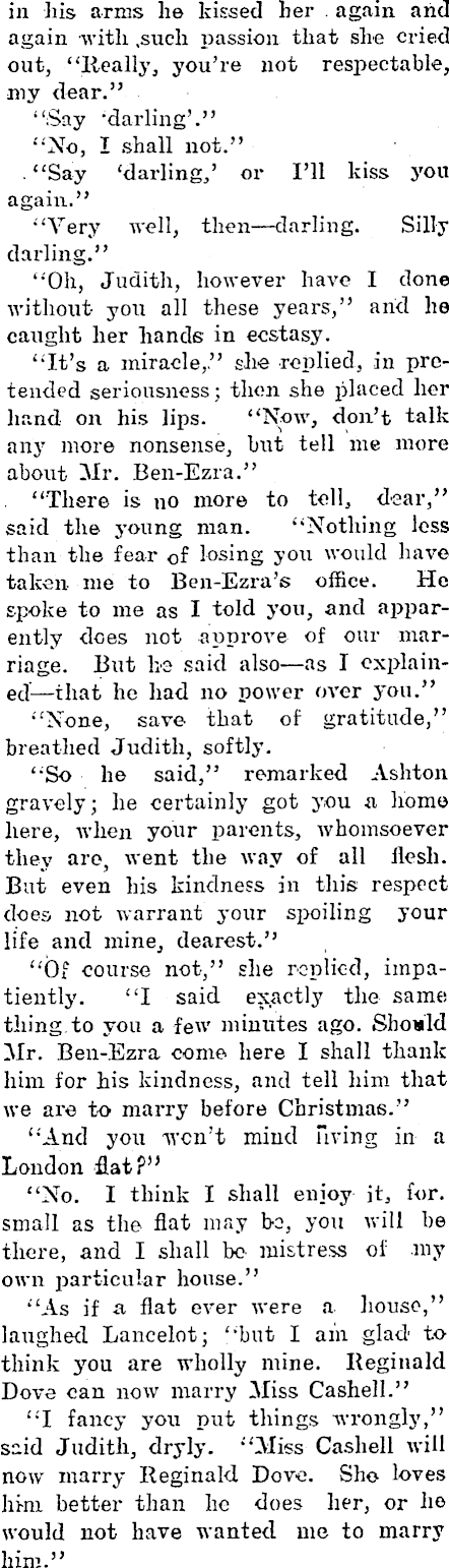 in his arms he kissed her again and again with .such passion that she cried out, “Really, you’re not respectable, my dear.” “Say •darling’.” “No, I shall not.” . “Say ‘darling,’ or I’ll kiss 3 r ou again.” “Very well, then —darling. Silly darling.” “Oh, Judith, however have I done without you all these years,” and he caught her hands in ecstasy. “It’s a miracle,” she replied, in pretended seriousness; then she placed her hand on his lips. “Now, don’t talk any more nonsense, but tell me more about Mr. Ben-Ezra.” “There is no more to tell, dear,” said the young man. “Nothing loss than the fear of losing you would have taken me to Ben-Ezra’s office. He spoke to me as I told you, and apparently does not approve of our marriage. Blit he said also—as 1 explained —that he had no power over you.” “None, save that of gratitude,” breathed Judith, softly. “So he said,” remarked Ashton gravely; he certainly got you a home here, when your parents, whomsoever they are, went the way of all flesh. But even his kindness in this respect does not warrant your spoiling your life and mine, dearest.” “Of course not,” she replied, impatiently. “I said exactly the same thing to you a few minutes ago. Should Mr. Ben-Ezra come here I shall thank him for his kindness, and tell him that we are to marry before Christmas.” “And you won’t mind Firing in a London flat?” “No. I think I shall enjoy it, for. small as the flat may bo, you will be there, and I shall be mistress of my own particular house.” “As if a flat ever were a house,” laughed Lancelot; “but I am glad' to think you are wholly mine. Reginald Dove can now marry Miss Cashed.” “I fancy you put tilings wrongly,” said Judith, dryly. “Miss Cashed will now marry Reginald Dove. Sho loves hkn better than he does her, or he would not have wanted me to marry him.”