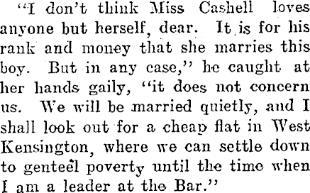 “I don’t think Miss Cashed loves anyone but herself, dear. It.is for Lis rank and money that she marries this boy. But in any case,” be caught at her hands gaily, “it does not concern us. We will be married quietly, and I shad look out for a cheap flat in West Kensington, where we can settle down to genteel poverty until the time when I am a leader at the Bar.”