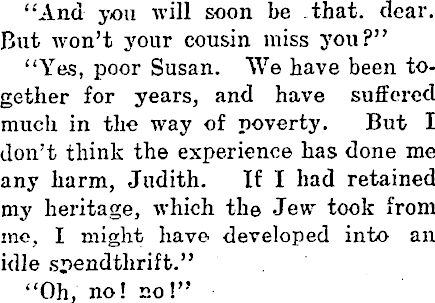 “And you will soon be that. dear. But won’t your cousin miss you?” “Yes, poor Susan. AVe have been together for years, and have suffered much in the way of poverty. But I don’t think the experience has done me any harm, Judith. If I had retained my heritage, which the Jew took from me, I might have developed into an idle spendthrift.” “Oh, no! no!”