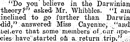 “Do yon believe in the Darwinian theory?” asked/ Mr. Whibbles. “I am inclined to go further than Darwin did,” answered! Miss Cayenne, “and LeKevo that some members of oiir ;ipecies have started ph a. return trip.”