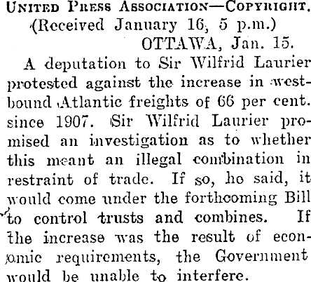 United Press Association —Copyright. ■(Received January 16, 5 p.m.) OTTAWA, Jan. 15. A deputation to Sir Wilfrid Laurier protested against the increase in westbound Atlantic freights of 66 per cent, since 1907. 'Sir Wilfrid Laurier promised an investigation as to whether this meant an illegal combination in restraint of trade. If so, ho said, it would come under the forthcoming Bill ’"to control trusts and combines. If the increase was the result of economic requirements, the Government would lie unable t-o interfere.