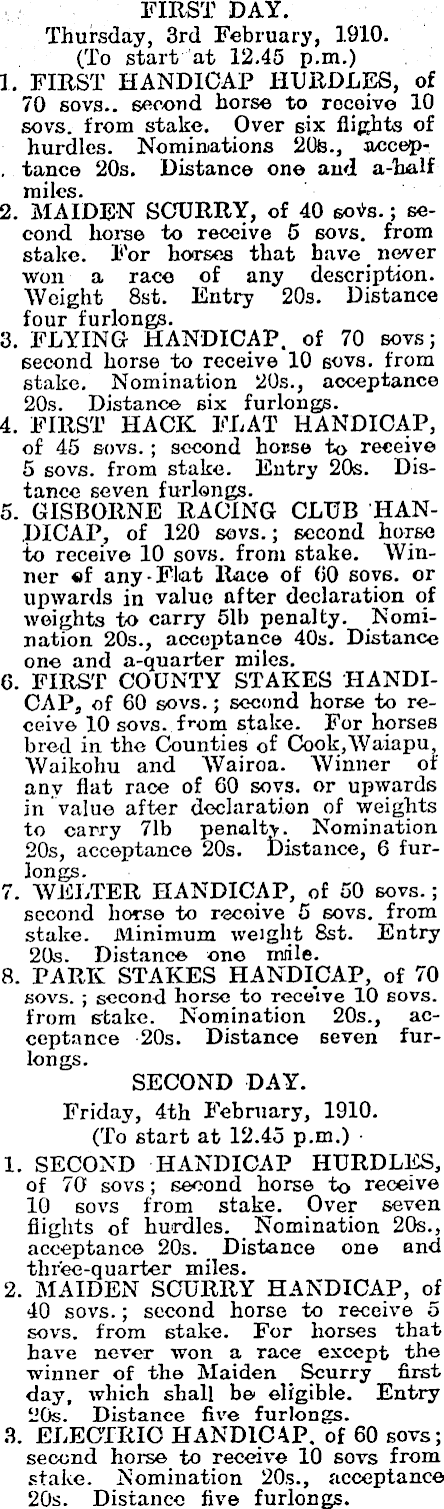FIRST DAY. Thursday, 3rd February, 1910. (To start at 12.45 p.m.) 1. FIRST HANDICAP HURDLES, of 70 sovs.. second horse to rocoive 10 sovs. from stake. Over six flights of hurdles. Nominations 20fe., accep- . tance 20s. Distance one and a-baif miles. 2. MAIDEN SCURRY, of 40 sote.; second horse to receive 5 sovs. from stake. For horses that have never won a race of any description. Weight Bst. Entry 20s. Distance four furlongs. 3. FLYING HANDICAP, of 70 sovs; second horse to receive 10 sovs. from stake. Nomination 205., acceptance 20s. Distance six furlongs. 4. FIRST HACK FLAT HANDICAP, of 45 sovs. ; second horse to receive 5 sovs. from stake. Entry 20s. Distance seven furlongs. 5. GISBORNE RACING CLUB HANDICAP, of 120 sovs.; second horse to receive 10 sovs. from stake. Winner of any-Flat Race of 00 soys, or upwards in value after declaration of weights to carry 51b penalty. Nomination 205., acceptance 40s. Distance one and a-quarter miles. 6. FIRST COUNTY STAKES HANDICAP, of 60 sovs.; second horse to receive 10 sovs. f r om stake. For horses bred in the Counties of Cook,Waiapu, Waikohu and Wairoa. Winner of anv flat race of 60 sovs. or upwards in value after declaration of weights to carry 71b penalty. Nomination 20s, acceptance 20s. Distance, 6 furlongs. 7. WELTER HANDICAP, of 50 sovs.; second horse to recoive 5 sovs. from stake. Minimum weight Bst. Entry 20s. Distance one rnrile. 8. PARK STAKES HANDICAP, of 70 sovs. ; second horse to receive 10 sovs. from stake. Nomination 205., acceptance 20s. Distance seven furlongs. SECOND DAY. Friday, 4th February, 1910. (To start at 12.45 p.m.) 1. SECOND HANDICAP HURDLES, of 70 sovs; second horse to receive 10 sovs from stake. Over seven flights of hurdles. Nomination 205., acceptance 20s. # Distance one and three-quarter miles. 2. MAIDEN SCURRY HANDICAP, of 40 sovs.; second horse to receive 5 sovs. from stake. For horses that have never won a race except the winner of the Maiden _ Scurry first day, which shall be eligible. Entry 20s. Distance five furlongs. 3. ELECTRIC HANDICAP, of 60 sovs; second horse to receive 10 sovs from stake. Nomination 205., acceptance 20s. Distance five furlongs.