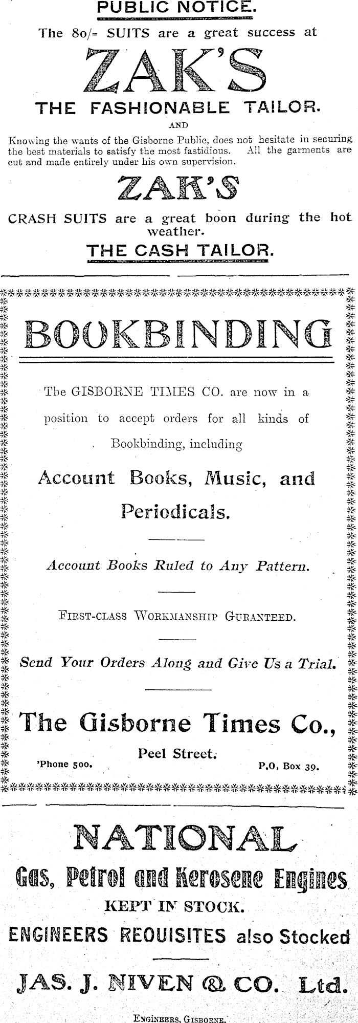 PUBLIC NOTICE. The 80/- SUITS are a great success at ZAKS THE FASHIONABLE TAILOR. AND Knowing the wants of the Gisborne Public, does not hesitate in securing the best materials to satisfy the most fastidious. All the garments are cut and made entirely under his own supervision. CRASH SUITS are a great boon during the hot weather. THE CASH TAILOR. BOOKBINDING The GISBOBNE TIMES CO. are now in a position to accept orders for all kinds of Bookbinding, including Account Books, Music, and Periodicals. Account Books Ruled to Any Pattern. Eirst-class 'Workmanship Guranteed. Send Your Orders Along and Give Us a Trial. The Gisborne Times Co., Peel Street. ’Phone 500. P.O, Box 39. NATIONAL fins. Petrel M Kerosene Engines KEPT IN STOCK. ENGINEERS REQUISITES also Stocked JAS. J. IWVE-N <& CO. Ltd. Engineers, Gisborne.