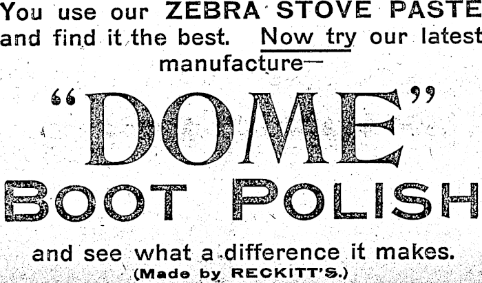 You use our ZEBRA STOVE PASTE and find it the best. Now try our latest manufacture—a BOOT POLISH and see what a difference it makes. CMade by RECKITT'S.)