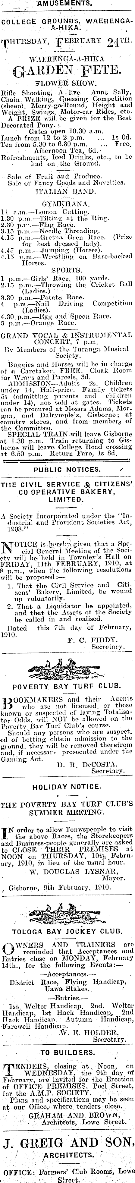 AMUSEMENTS. COLLEGE GROUNDS, WAERENGA-A-HIKA. 'JTHTTIISDA.Y, jT'EBRUARY 24 th - W A EIIE NG A - A-HIK A GARDEN FETE. FLOWER SHOW. Rifle Shooting, A live Aunt Sally, Chain Walking, Guessing Competition (sheetA. Merry-goJl-ound, Height and Weight, Swings, Motor-car Rides, etc. A PRIZE will bo given for the Best Decorated Pony. Gates open 10.30 a.m. Lunch from 12 to 2 p.m. ... Is Od. Tea from 5.30 to 6.30 p.m. ... Free. Afternoon Tea, 6d. Refreshments, Iced Drinks, etc., to be had on the Ground. Sale of Fruit and Produce. Sale of Fancy Goods and Novelties. ITALIAN BAND. GYMKHANA. 11 a.m. —Lemon Cutting. 1.30 p.m.—Tilting at the Ring. 2.30 p.r■.—Flag Race. 3.15 p.m.—Needle Threading. 4.15 p.m. —Gretna Gren Race. (Prize for best dressed lady). 4.45 p.m.—Jumping (Horses). 4.15 r>.m. —Wrestling on Bare-backed Horses. SPORTS. 1 p.m.—Girls’ Race, 100 yards. 2.15 p.m.—Throwing the Cricket Ball (Ladies.) 3.30 p.m.—Potato Race. 4 p.m. —Nail Driving Competition (Ladies). 4.30.p.m.—Egg and Spoon Race. 5 p.m.—Orange Race. GRAND VOCAL & INSTRUMENTAL CONCERT, 7 p.m. By Members of the Turanga Musical Society. Buggies and Horses will ho in charge of a Caretaker, FREE. Cloak Room for Wraps and Parcels, 3d. ADMISSION—AduIts 2s. Children under 14, Half-price. Family tickets 5s (admitting parents and children under 14), not sold at gates. Tickets can be procured at Messrs Adams, Morgan, and Dalrymple’s, Gisborne; at country stores, and from members of the Committee. SPECIAL TRAIN will leave Gisborne at 1.30 p.m. Train returning to Gisborne will leave. College Road crossing at 6.50 p.m. Return Fare, Is Bd. PUBLIC NOTICES. THE CIVIL SERVICE ,& CITIZENS’ CO OPERATIVE BAKERY, LIMITED. A Society Incorporated under the “Industrial kind Provident Societies Act, 1908.” VTOTICE is hereby, given that a Spe_aj cial General Meeting of the Socitv will be held in Townley’s Hall on 'RIDAY, 11th FEBRUARY, 1910, at p.m., when the following resolutions •ill be proposed : 1. That the Civil Service and Citizens’ Bakerv, Limited, be wound up voluntarily. 2. That a Liquidator be appointed, and that the Assets of the Society l)e called in and realised. Dated this 7th dav of February, 910. F. C. FIDDY. Secretary. POVERTY BAY TURF CLUB. BOOKMAKERS and their Agents j) who ar-e not licensed, or those nvn or suspected of laying TotalisaOdds. will NOT be allowed on the rertv Bay Turf Club’s course, should any persons who are suspect, of betting obtain admission to the iund. they will be removed therefrom 1, if neoessnrv prosecuted under the ming Act. D. R. DoCOSTA, Secretary. _ HOLIDAY NOTICE. THE POVERTY BAY TURF CLUB'S SUMMER MEETING. IN order to allow Tomvspcople to visit the above Races, the Storekeepers and Business-people generally are asked to CLOSE THEIR PREMISES at NOON on THURSDAY, 10th February, 1910, in lieu of the usual hour. W. DOUGLAS LYSNAR, Mayor. , Gisborne, 9th February, 1910. TOLOGA BAY JOCKEY CLUB. OWNERS AND TRAINERS are reminded that Acceptances find Entries close on MONDAY, February 14th., for the following Events:— —Acceptances.— District Race, Flying Handicap, Uawa Stakes. —Entries.— Ist. Welter Handicap. 2nd. Welter Handicap, Ist Hack Handicap* 2nd Hack Handicap. Autumn Handicap, Farewell Handicap. aV. e. holder. Secretary. TO BUILDERS. TENDERS, closing at Noon, on WEDNESDAY, the 9th day of February, are invited for the Erection of OFFICE PREMISES, Peel Street, for the A.M.P. SOCIETY. Plans and specifications may be seen at our Office, where tenders close. GRAHAM AND BROWN, Architects, Lowe Street. J. GREIG AND SON, ARCHITECTS. OFFICE: Farmers’ Club Rooms, Low© ; . Street.