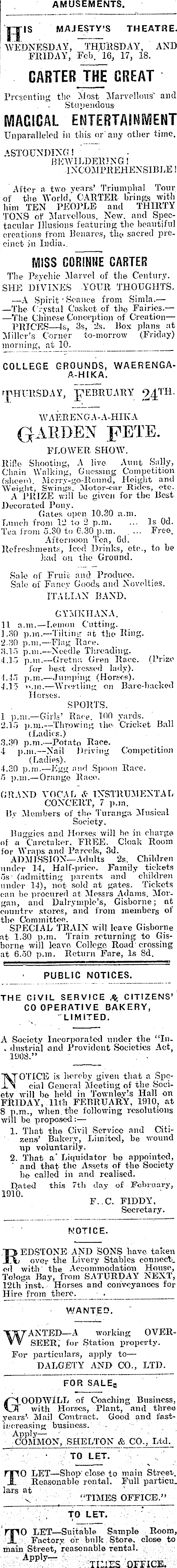 AMUSEMENTS. MAJESTY’S THEATRE. WEDNESDAY, THURSDAY, AND FRIDAY, Fob. 16, 17, 18. CARTER THE GREAT Presenting the Most Marvellous' and Stupendous’ MAGICAL ENTERTAINMENT Unparalleled in this or'any other time. ASTOUNDING ! BE WILDERING! INCOMPREHENSIDLE! After a two years’ Triumphal Tour of the World,’ CARTER brings with him TEN PEOPLE and THIRTY TONS of Marvellous. New. and Spectacular Illusions featuring the beautiful creations from Benares, the sacred precinct in India.. MISS CORINNE CARTER The Psychic Marvel of the Century. SHE DIVINES YOUR THOUGHTS. —A Spirit • Seance from Simla. — —The Crystal Casket of the Fairies. — —The Chinese Conception of Creation — PRICES—4s, 3s, 2s. Box plans at Miller’s Corner to-morrow (Friday) morning, at 10. COLLEGE GROUNDS, WAERENGA-A-HIKA. rjTHURSDAY, jAEBRUARY 24 th - W AEREN G A-A-HIKA GARDEN FETE. FLOWER SHOW. Rifle Shooting, A live. Aunt Sally, Chain Walking, Guessing Competition (sheenl. Mcrry-go-Round, Height ami Weight, Swings. Motor-car Rides, etc. A PRIZE will he given for the Best Decorated Pony. Gates open 10.30 a.m. | Lunch from 12 to 2 p.m. ... Is Od. Tea from 5.30 to 6.30 p.m. . .Free. Afternoon Tea, 6d. Refreshments, Iced Drinks, etc., to be .had on the Ground. Sale of Fruit and Produce. Sale of Fancy Goods and Novelties. ITALIAN BAND. GYMKHANA. 11 a.m.— Lemon Cutting. 1.30 p.m. —Tilting at the Ring. 2-30 p.m. —Flag Rare. 3.15 p.m. —Needle Threading. •1.15 p.m. —Gretna Gren Race. (Prize for best dressed lady). 1.15 p.m.—Jumping (Horses). 1.15 mm. —Wrestling on Bare-backed Horses. SPORTS. 1 p.m.—Girls’ Race. 160 yards. 2.15 p.m.—Throwing the Cricket Ball (Ladies.) 3.30 p.m.—Potato Race. 4 p.m. —Nail Driving Competition (Ladies). 4.30 p.m.—Egg and Spoon Race. 5 p.m.—Orange Race. GRAND VOCAL Sr INSTRUMENTAL CONCERT, 7 p.m. By Members of the Turanga Musical Society. Buggies and Horses will he in charge of a Caretaker. FREE. Cloak Room for Wraps and Parcels, 3d. ADMISSION—AduIts ‘2s. Children under 14, Half-price. Family tickets 5s (admitting parents and children under 14), not sold at gates. Tickets can he procured at Messrs Adams. Morgan, and Dalrymple’s, Gisborne; at country stores, and from members of the Committee. SPECIAL TRAIN will leave Gisborne at 1.30 p.m. Train returning to Gisborne will leave College Road crossing at 6.50 p.m. Return Fare, Is Bd. PUBLIC NOTICES. THE CIVIL SERVICE CITIZENS’ CO OPERATIVE BAKERY, ' LIMITED. A Society Incorporated under the “In- . dust-rial and Provident Societies Act, 1908.” CTOTICE is hereby given that a Spe- \ cial General Meeting of the Soci•v will he hold in Townley’s Hall on RIDAY, 11th FEBRUARY, 1910, at p.m., when, the following resolutions ill be proposed:— 1. That the Civil Service and Citizens’ Bakery, Limited, be wound up voluntarily. 2. That a’ Liquidator he appointed, and that- the Assets of the Society he called in and realised. Rated 1910. this 7th clay of February, F..C. FIDDY, Secretary. NOTICE. REDSTONE AND SONS have, taken over the Livery Stables connect, ed with the Accommodation House, Tologa Bay, from SATURDAY NEXT, 12th inst. Horses and conveyances for Hire from there. WANTED. WANTED— A working OVER SEER, for Station property. For particulars, apply to — DALGETY AND CO., LTD. FOR SALE e GOODWILL of Coaching Business, with Horses, Plant, and three years’ Mail Contract. Good and fastincreasing business. Apply — COMMON, SHELTON & CO., Ltd. TO LET. TO LET—Shop close to main Street. Reasonable rental. Full particulars at “TIMES OFFICE.” TO LET. TO LET—Suitable Sample Room, Factory of bulk Store, close to main Street, reasonable rental. Apply— TIMES OFFICE.