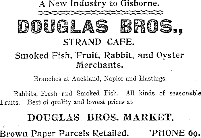 A New Industry to Gisborne. DOUeLA^BROS., STRAND CAFE. Smoked Fish. Fruit, Rabbit, and Oyster Merchants. Branches at Auckland, Napier and Hastings. Babbits, Fresh and Smoked Fish. AIL kinds of seasonable Fruits. Best of quality and lowest prices at DOUGLAS BROS. MARKET. Brown Paper Parcels Retailed. ’PHONE 69.