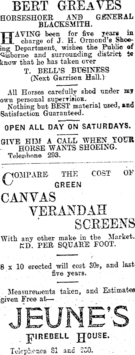 BERT GREAVES HORSESHOER AND GENERAL BLACKSMITH. HAVING been for five years in charge of J. H. Ormond’s Shoeing Department, wishes the Public of Gisborne and surrounding district to know that ho has taken over T. BELL’S BUSINESS (Next Garrison Hall.) All Horses carefully shod under my own personal supervision. Nothing but BEST material used, and Satisfaction Guaranteed. OPEN ALL DA)M)N SATURDAYS. GIVE KIM A CALL WHEN YOUR HORSE WANTS SHOEING. Telephone 293. /COMPARE THE COST OE GREEN CANVAS VERANDAH SCREENS With any other make in the Market. KD. PER SQUARE FOOT. 8 x 10 erected will cost 30s, and last five years. Measurements taken, and Estimates given Free at—jgOUSE. Telephones SI and ISO.