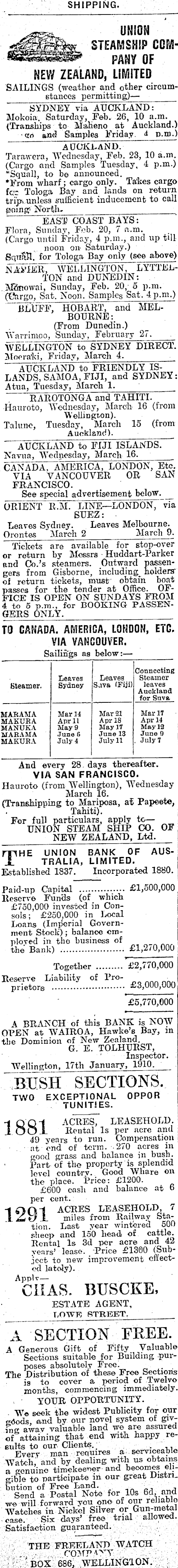 SHIPPING. UNION STEAMSHIP COMPANY OF NEW ZEALAND, LIMITED SAILINGS (weather and other circumstances permitting)— SYDNEY via AUCKLAND: Mokoia. Saturday, Feb. 26, 10 a.m. (Tranships to Maheno at Auckland.) ■<2o and Samples Friday <1 p.m.) AUCKLAND. Tarawera, Wednesday, Feb. 23, 10 a.m. (Cargo and Samples Tuesday, 4 p.m.) * Squall, to bo announced. *From wharf; cargo only. Ta'kes cargo fc~: Tologa Bay and lands on return trip, unless sufficient inducement to call going North- ‘ EAST COAST BAYS: Flora, Sunday, Feb. 20, 7 a.m. (Cargo until Friday, 4 p.m., and up till noon on Saturday.) ScpiTiH. for Tologa Bay only (see above) N ALTER, WELLINGTON, LYTTELTON and DUNEDIN: Affirmwai, Sunday, Feb. 20, 5 p.m. (Cargo, Sat. Noon. Samples Sat. 4 p.m.) BLUFF, HOBART, and MELBOURNE: (From Dunedin.) Warrimoo, Sunday, February 27. WELLINGTON to SYDNEY DIRECT. Moera'ki, Friday, March 4. AUCKLAND to FRIENDLY ISLANDS, SAMOA, FIJI, and SYDNEY: Atua, Tuesday, March 1. RAROTONGA and TAHITI. Hauroto, Wednesday, March 16 (from Wellington). Taluno, Tuesday, March 15 (from Auckland). AUCKLAND to FIJI ISLANDS. Navua, Wednesday, March 16. CAN A DAT AMERICA, LONDON, Etc. VIA VANCOUVER OR SAN FRANCISCO. See special advertisement below. ORIENT R.M. LINE—LONDON, via SUEZ: Leaves Sydney. Leaves Melbourne. Orontes March 2 March 9. 'Tickets are available for stop-over or return by Messrs Huddart-Parker and Co.’s steamers. Outward passengers from Gisborne, holders' of return tickets, must obtain boat passes for the tender at Office. OFFICE IS OPEN ON SUNDAYS FROM i to 5 p.m., for BOOKING PASSENGERS ONLY. TO CANADA. AMERICA, LONDON, ETC. VIA VANCOUVER. Sailings as below:— And every 28. days thereafter VIA SAN FRANCISCO. Hauroto (from Wellington), Wednesday March 16. (Transhipping to Mariposa, at Papeete, Tahiti). For full particulars, apply tc— UNION STEAM SHIP CO. OF NEW ZEALAND, Ltd. The union bank of Australia, LIMITED. Established 1837. Incorporated 1880. Paid-up Capital £1,500,000 Reserve Funds (of which £750,000 invested in Consols ; £250,000 in Local Ivoans (Imperial Government Stock); balance employed in the business of the Bank) £1,270,000 Together £2,770,000 Reserve Liability of Pro- _ prietors £3,000,000 £5,770,000 A BRANCH of this BANK is NOW OPEN at WAIROA, Hawke’s Bay, in the Dominion of New Zealand G. E. TOLHURST, ‘ Inspector. Wellington, 17th January, 1910, BUSH SECTIONS. TWO EXCEPTIONAL OPPOR TUNITIES. iO Q 1 ACRESL LEASEHOLD. ] 00l Rental Is per acre and 49 years to run. Compensation at end of term. 270 acres in good grass and balance in bush. Part of the property is splendid level country. Good Whare on the place. Price: £I2OO. £6OO cash and balance at 6 per cent. an-j ACRES LEASEHOLD, 7 miles from Railway Station. Last year wintered 500 sheep and 150 head of cattle. Rental Is 3d per acre and 42 years’ lease. Price £I3OO (Subjject to new improvement effected lately). Applv— CIIAS. BUSCKE, ESTATE AGENT, LOWE STREET. A SECTION FREE. A Generous Gift of Fifty Valuable Sections suitable for Building purposes absolutely Free. The Distribution of these. Free Sections is to cover a period of Twelve months, commencing immediately. YOUR OPPORTUNITY. We seek the widest Publicity for our gdods, and by our novel system of giving away valuable land we aie assured of attaining that end with happy results to our Clients. _ ~ Every man requires a serviceable Watch, and by dealing with us obtains a genuine timekeeper and becomes eligible to participate in our great Distribution of Free Land. _ , , Send a Postal Note for 10s 6d, and we will forward you one of our reliable Watches in Nickel Silver or Gun-metal ease. Six days’ free trial allowed. Satisfaetion guaranteed. THE FREELAND WATCH COMPLY BOX 686, WELLINGTON.