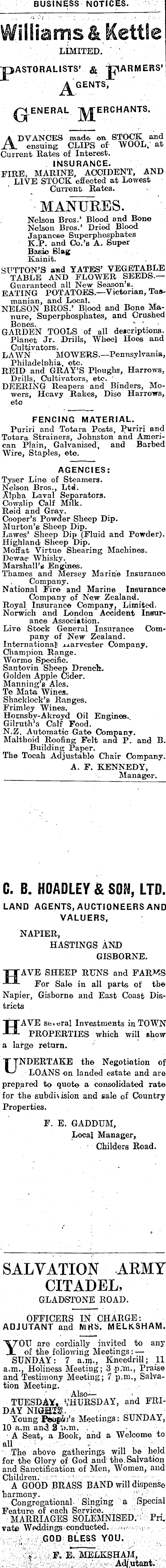 BUSINESS NOTICES. Williams & fettle LIMITED. jASTORALISTS’ & F ARMERS’ GENERAL M ERCHANTS. Advances mad© on stock and ensuing CLIPS of WOOL, at Current Rates of Interest. INSURANCE. FIRE, MARINE, ACCIDENT, AND LIVE STOCK effected at Lowest Current Rates. ■ MANURES. Nelson Bros.’ Blood and Bone Nelson Bros.’ Dried Blood Japanese Superphosphates K.P. and Co.’s A. Super Basic Slag Kainit. SUTTON’S and YATES’ VEGETABLE TABLE AND FLOWER SEEDS Guaranteed all New Season’s. EATING POTATOES. —Victorian, Tasmanian, and Local. NELSON BROS.’ Blood and Bone Manure, Superphosphates, and Crushed Bones. GARDEN TOOLS of all descriptions. Planet Jr. Drills, Wheel Hoes and Cultivators. LAWN MOWERS.—Pennsylvania, Philadelphia, etc. REID and GRAY’S Ploughs, Harrows, Drills, Cultivators, etc. DEERING Reapers and Binders, Mowers, Heavy Rakes, Disc Harrows, etc FENCING MATERIAL. Puriri and Totara Posts, Puriri and Totara Strainers, Johnston and American Plain, Galvanised, and Barbed Wire, Staples, etc. AGENCIES: Tyser Line of Steamers. Nelson Bros., Ltd. Alpha Laval Separators. Cowslip Calf Milk. Reid and Grav. Cooper’s Powder Sheep Dip. Murton’6 Sheep Dip. Lawes’ Sheep Dip (Fluid and Powder). Highland Sheep Dip. Moffat Virtue Shearing Machines. Dewar Whisky. Marshall’s Engines. Thames and Mersey Marine Insurance Company. National Fire and Marine Insurance Company of New Zealand. Royal Insurance Company, Limited. Norwich and London Accident Insurance Association. Live Stock General Insurance Company of New Zealand. International! xxarvester Company. Champion Range. Wormo Specific. Santovin Sheep Drench. Golden Apple Cider. Manning’s Ales. Te Mata Wines. Shaddock’s Ranges. Frimley Wines. Hornsbv-Akroyd Oil Engines.. Gilruth’s Calf Food. N.Z. Automatic Gate Company. Malthoid Roofing Felt ana P. and B. Building Paper. The Tocah Adjustable Chair Company. A. F. KENNEDY, Manager. G. B. HOADLEY & SON, LTD. LAND AGENTS, AUCTIONEERS AND VALUERS, NAPIER, HASTINGS AND GISBORNE. WAVE SHEEP RUNS and For Sale in all parts of the Napier, Gisborne and East Coast Districts HAVE several Investments in TOWN PROPERTIES which will show a large return. TTNDERTAKE the Negotiation of LOANS on landed estate and are prepared to quote a consolidated rate for the subdivision and sale of Country Properties. F. E. GADDUM, Local Manager, Childers Road. SALVATION ARMY CITADEL, GLADSTONE ROAD. OFFICERS IN CHARGE: ADJUTANT and MRS. MELK.SHAM. YOU are cordially invited to any of the following Meetings: SUNDAY: 7 a.m., Kneedrill; .11 a.m., Holiness Meeting; 3 p.m., Praise and Testimony Meeting; 7 p.m., Salvation Meeting. Also— TUESDAY, THURSDAY, and FRIDAY NIGHXS. Young Meetings: SUNDAY, 10 a.m and 2 U.m. A Seat, a Book, and a Welcome to all The above gatherings will be held for the Glory of God and the,Salvation and Sanctification of Men, Women, and Children. A GOOD BRASS BAND will dispense harmony. . . . Congregational Singing a Special Feature of each Service. MARRIAGES SOLEMNISED. Pri. vate Weddings conducted. GOD BLESS YOU. F. E. MELKSHAM, Adjutant.