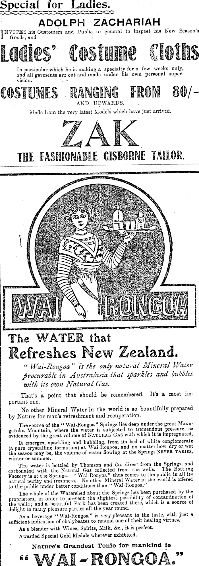 Special for Ladies. ADOLPH ZACHARIAH TNVITES his Customers and Public in general to inspeet his New Season 3 1 Goods, and Ladles’ cosine cioins In particular which he is making a specialty for a few weeks only, and all garments arc cut and made under his own personal supervision. COSTUMES RANGING FROM B®/AND UPWARDS. Made from the very latest Models which have just arrived. ZAK THE FASHIONABLE OISBOINE TAILOR. m l’l> HON The WATER that Refreshes New Zealand. “ Wai-Rongoa " is the only natural Mineral Water procurable in Australasia that sparkles and bubbles with its own Natural Gas. That’s a point that should bo remembered. It’a a most null portant one. No other Mineral Water in the world is so bountifully prepared by Nature for man’s refreshment and recuperation. The source of the “ Wai-Rongoa” Springs lies deep under the great Maungatoka Mountain, where the water is subjected to tremendous pressure, as evidenced by the great volume of Natural Gas with which it is impregnated, It emerges, sparkling and babbling, from its bed of white conglomerate (a pure crystalline formation) at Wai-Rongoa, and no matter how dry or Met the season may be, the volume of water flowing at the Springs NEVER VARIES, winter or summer. I The water is bottled by Thomson and Co. direct from the Springs, and carbonated with the Natural Gas collected from the wells. The Bottling Factory is at the Springs. “ Wai-Rongoa” thus comes to the public in aU its natural purity and freshness. No other Mineral Water world is onered to the public under better conditions than “ W'ai-Rongoa.” The whole of the Watershed about the Springs has been purchased by the proprietors, in order to prevent the slightest possibility of contamination of the well?.!; and a beautiful Park lias been created there, which is a source of delight to many pleasure parties all the year round. Asa beverage “Wai-Rongoa” is very pleasant to the taste,.Mith just a sufficient indication of clialybeates to remind one of their healing virtues. As a blender with Wines, Spirits, Milk, &c., it is perfect. Awarded Special Gold Medals wherever exhibited. Nature’s Grandest Tonie for mankind io “WAI-RONGOA. 99