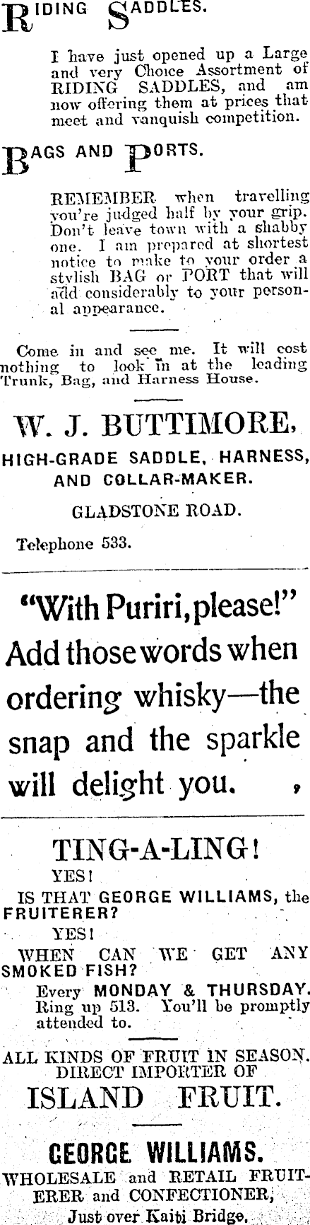 Riding gADDLES. I have just opened up a Large and very Choice Assortment of RIDING SADDLES, and am now offering them at prices thatmeet and vanquish competition. B AGS AND P ORTS. REMEMBER when travelling you’re judged half by your grip. Don’t leave town with a shabby one. I am prepared at shortest notice to make to your order a stylish BAG or PORT that will add considerably to yoitr personal appearance. Come, in and see me. It will cost nothing to look’ Tn at the leading Trunk, Bag, and Harness House. W. j. BUTTIMORE, HIGH-GRADE SADDLE, HARNESS, AND COLLAR-MAKER. GLADSTONE ROAD. Telephone 533. "With Puriri,please!” Add those words when ordering whisky —the snap and the sparkle will delight you. , TING-A-LING! YES! IS THAT GEORGE WILLIAMS, the FRUITERER? YES I WHEN CAN WE GET ANY SMOKED FISH? Every MONDAY & THURSDAY. Ring up 513. You’ll be promptly attended to. ALL KINDS OF FRUIT IN SEASON. DIRECT IMPORTER OF ISLAND FRUIT. GEORGE WILLIAMS. WHOLESALE and RETAIL FRUITERER and CONFECTIONER, Just over Ivaiti Bridge.