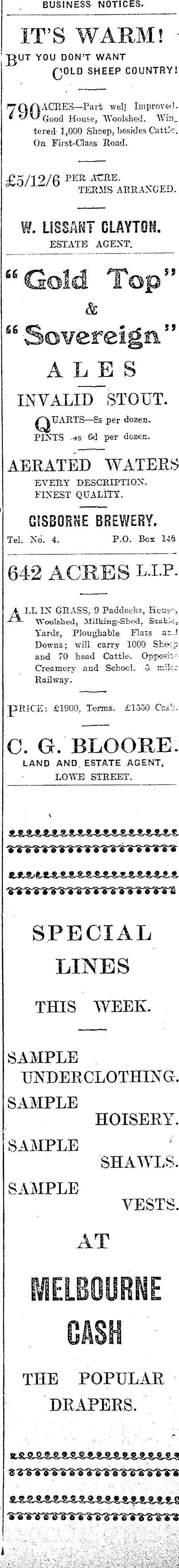 BUSINESS NOTICES. IT’S WARM! ■ JgUT YOU DON’T WANT QOLD SHEEP COUNTRY! rrQ A ACRES—Part well Improved. ® Good House, Woolshed. Win_ tered 1,000 Sheep, besides Cattle. On. First-Class Hoad. £5/12/6 PER ACRE. TERMS ARRANGED. W. LISSAHT OLAYTOH. ESTATE AGENT. “ Gold Top 5 ’ & S 6 Sovereign” ALES INVALID STOUT. —Bs per dozen. PINTS -is 6d per dozen. AERATED WATERS EVERY DESCRIPTION. FINEST QUALITY. GISBORNE BREWERY. Tel. No. 4. P.O. Box 146 642 ACRES L.I.P. ALL IN GRASS, 9 Paddocks, Ileus--, Woolshed, Milking-Shc-d. Srab.c. Yards, Pkragliable Flats ar. 1 Downs; -will carry 1000 She-: p and 70 head Cattle. OppositeCreamery and School, 5 imk~ Railway. pRICE: £I9OO, Terms. £l-3-50 Cash. C. G. BLOORE. LAND AND ESTATE AGENT, LOWE STREET. SPECIAL LINES THIS WEEK. SAMPLE UNDERCLOTHING. SAMPLE HOISERY. SAMPLE SHAWLS. SAMPLE VESTS. AT MELBOURNE GASH THE POPULAR DRAPERS.